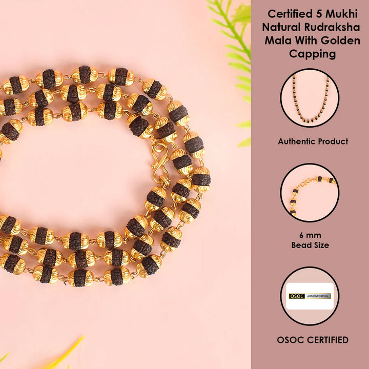 • Material: Certified 5 Mukhi Face Natural Rudraksha mala with golden Capping