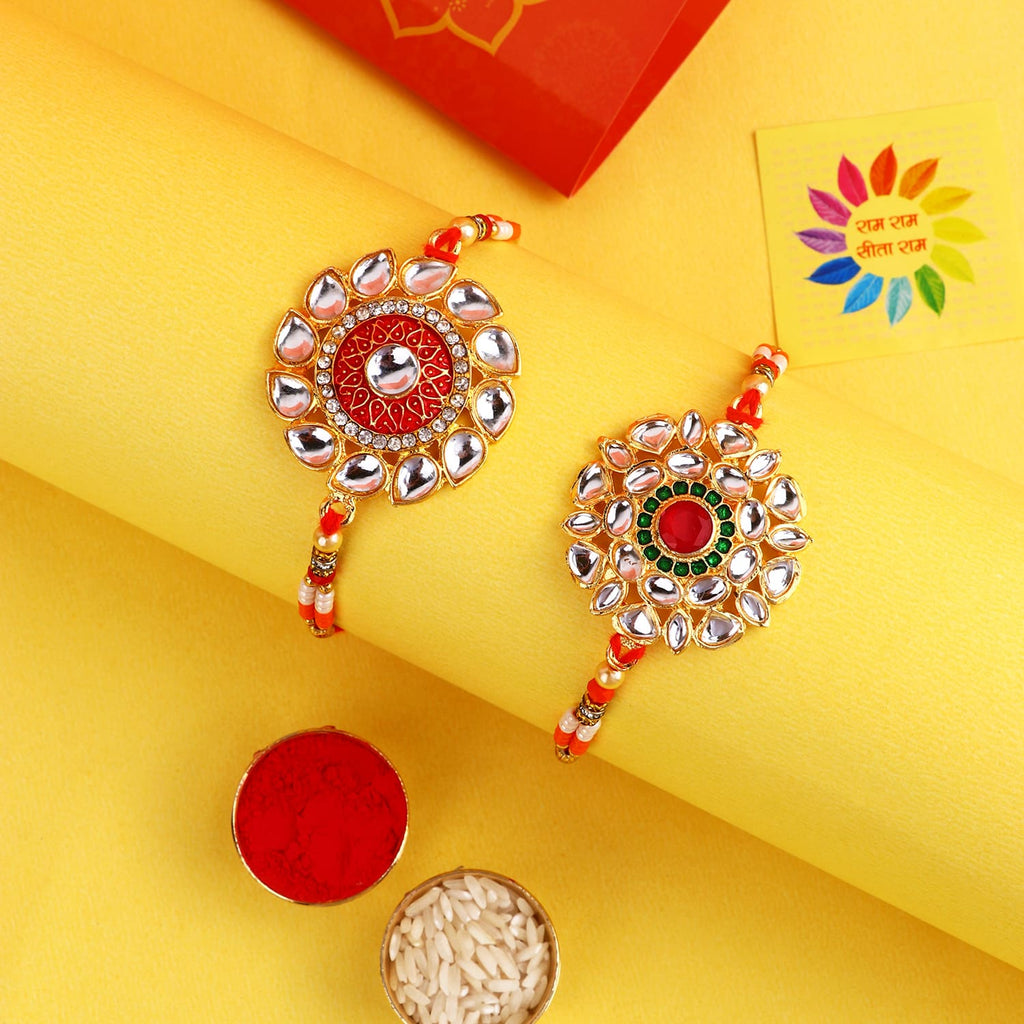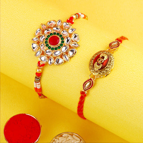 Kundan Bhaiya Rakhi Set of 2: Our Kundan Bhaiya Rakhi set epitomizes elegance and grandeur. Encrusted with dazzling Kundan stones, these rakhis are a symbol of the everlasting bond shared between siblings.