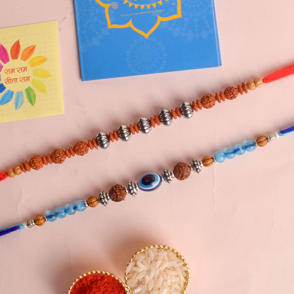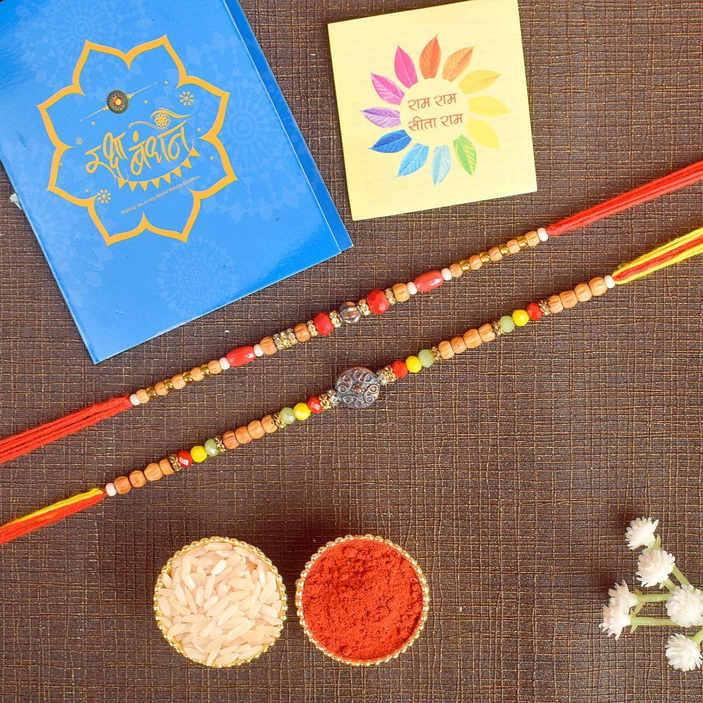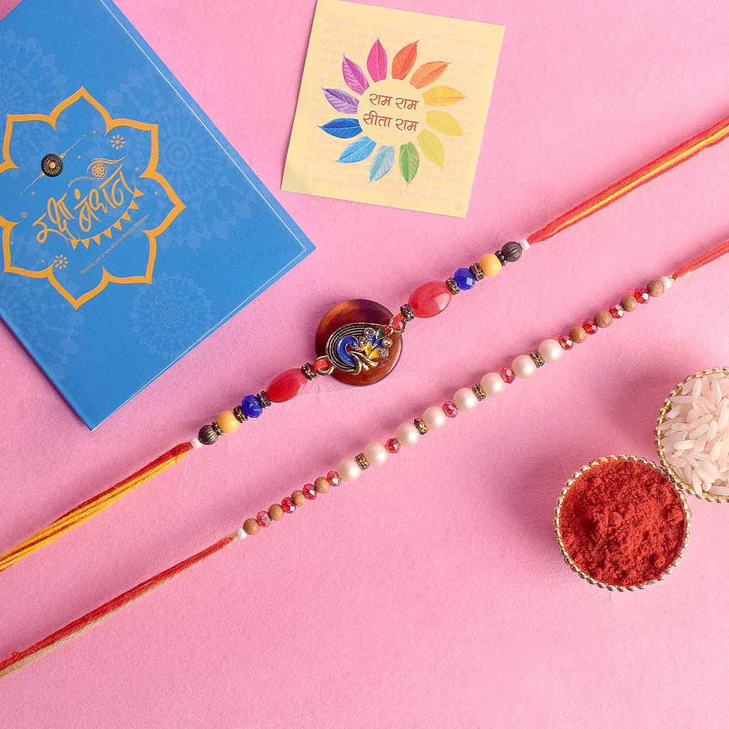 Beaded Bhaiya Rakhi Set of 2: Bedecked with colorful beads, these rakhis represent the joyous moments and cherished memories of growing up together. Embrace nostalgia and affection with this delightful beaded rakhi set.