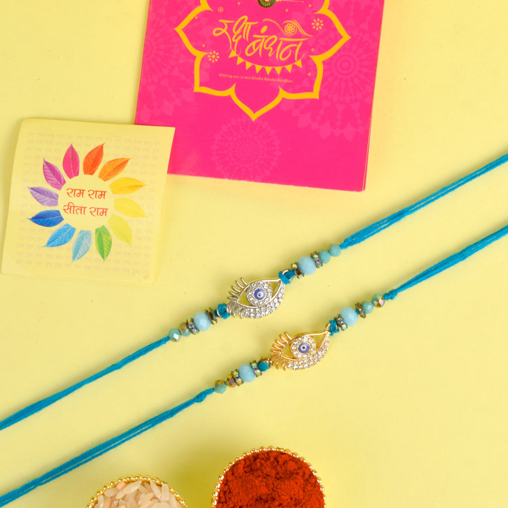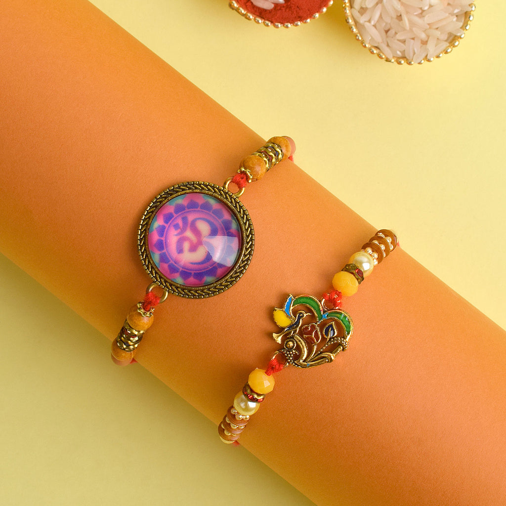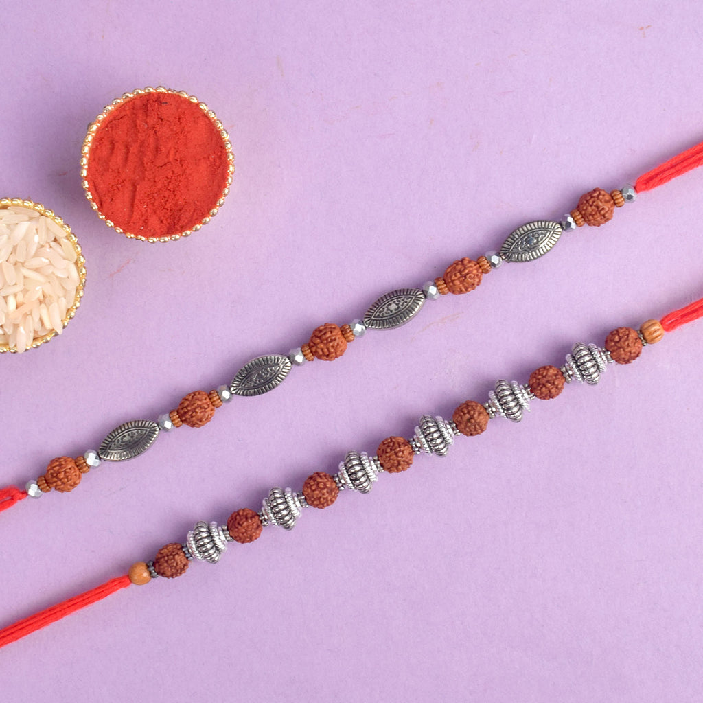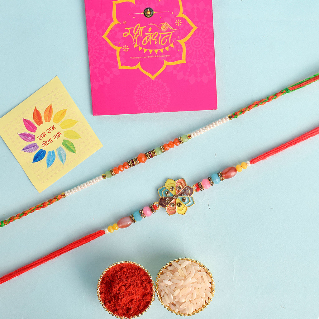 Beaded Bhaiya Rakhi Set of 2: Bedecked with colorful beads, these rakhis represent the joyous moments and cherished memories of growing up together. Embrace nostalgia and affection with this delightful beaded rakhi set.