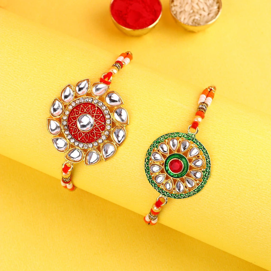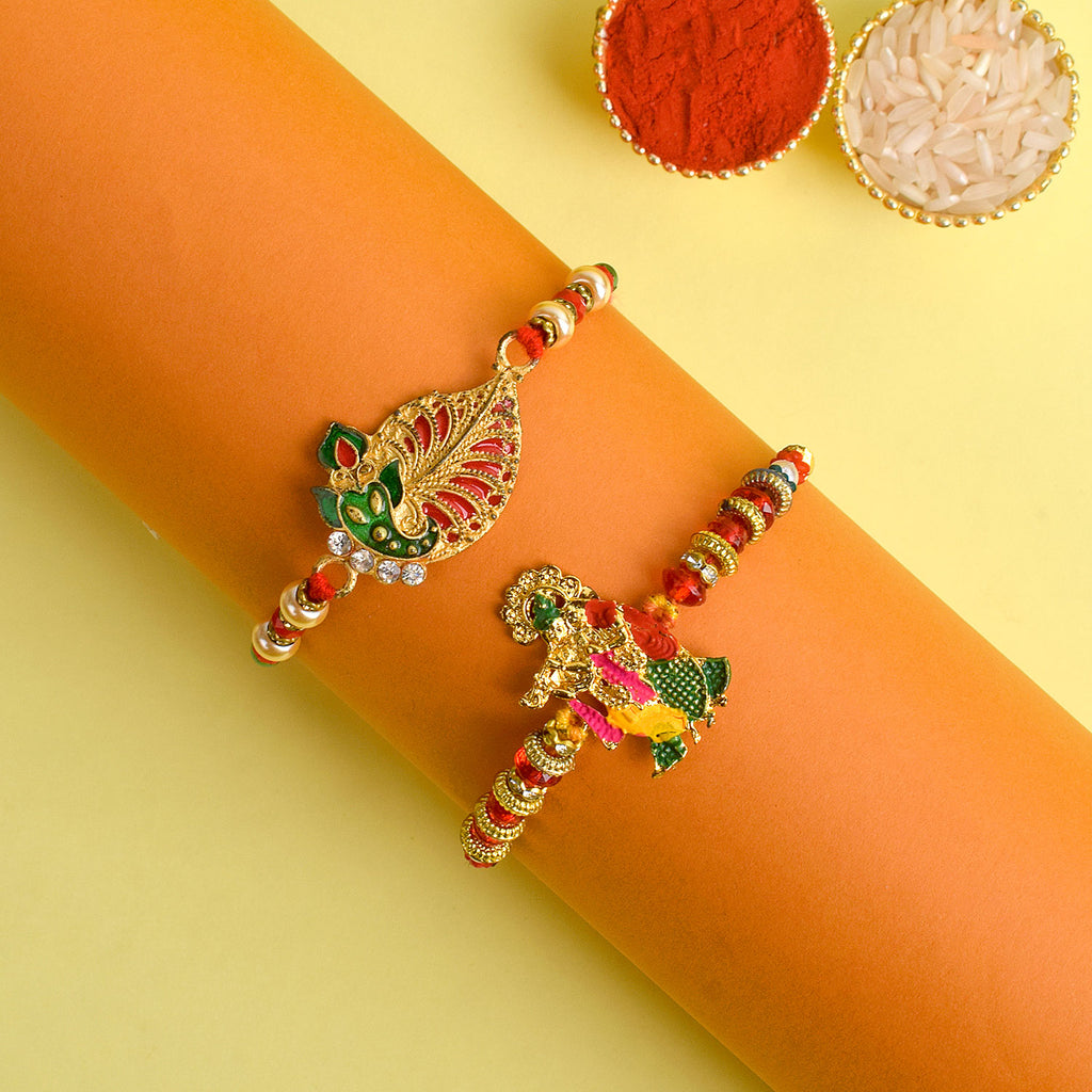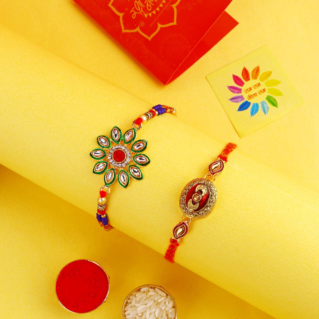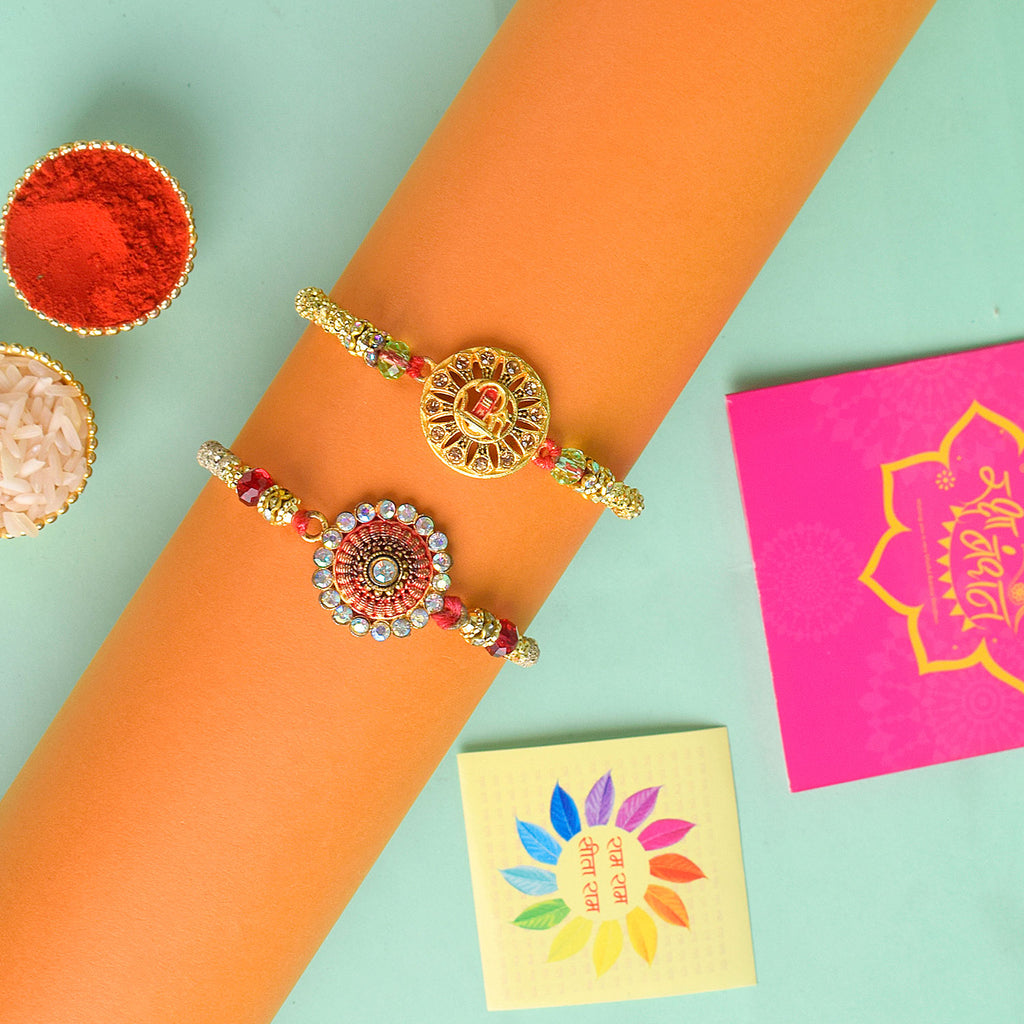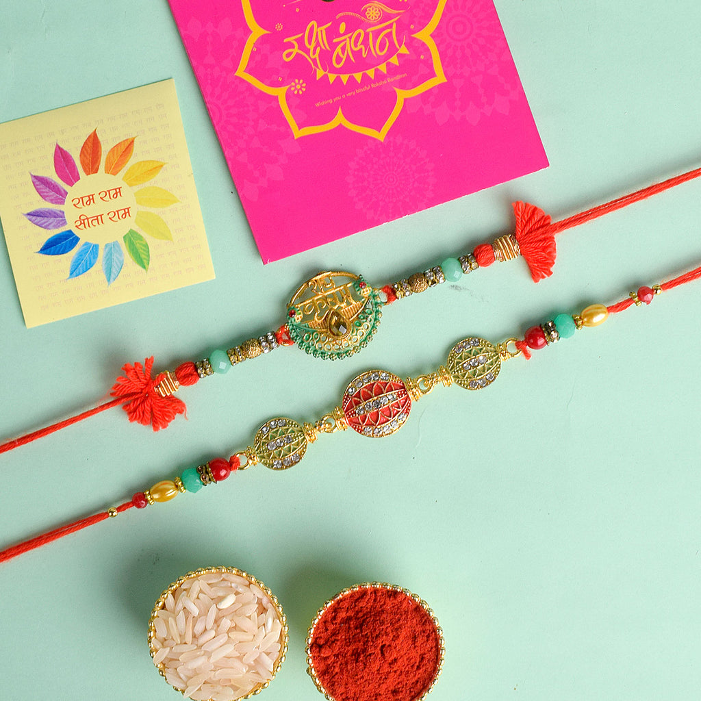 Meenakari Rakhi Set of 2: Adorned with intricate Meenakari work, these rakhis exude the essence of cultural heritage and artistic finesse. The vibrant colors and delicate patterns make these rakhis a true celebration of sibling love.