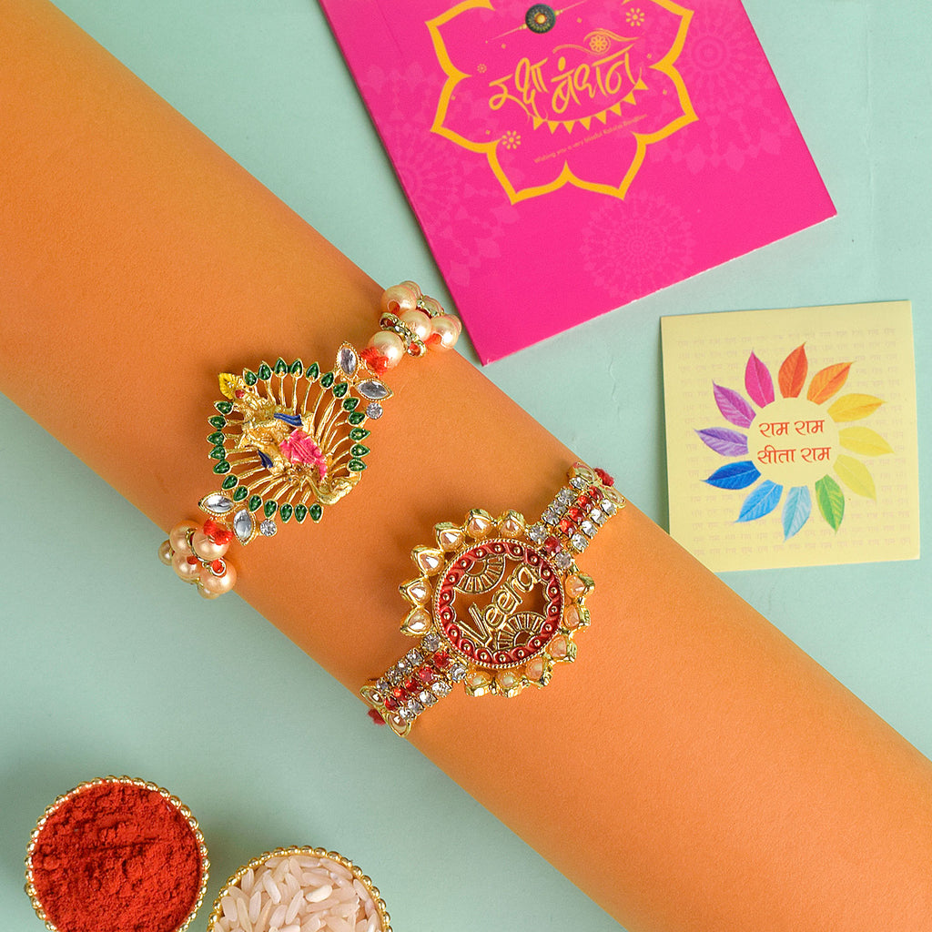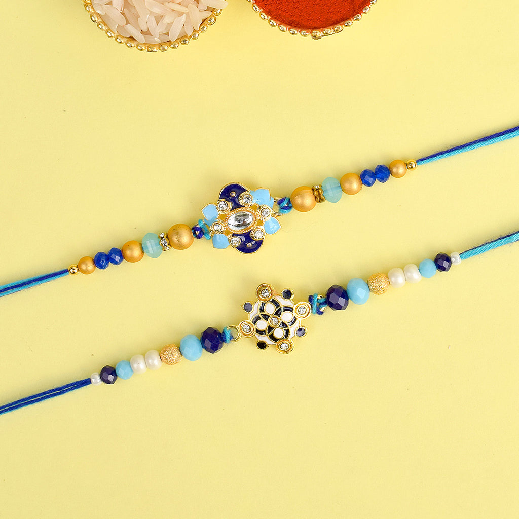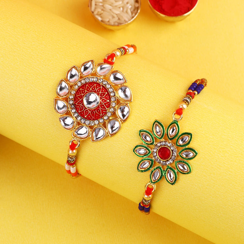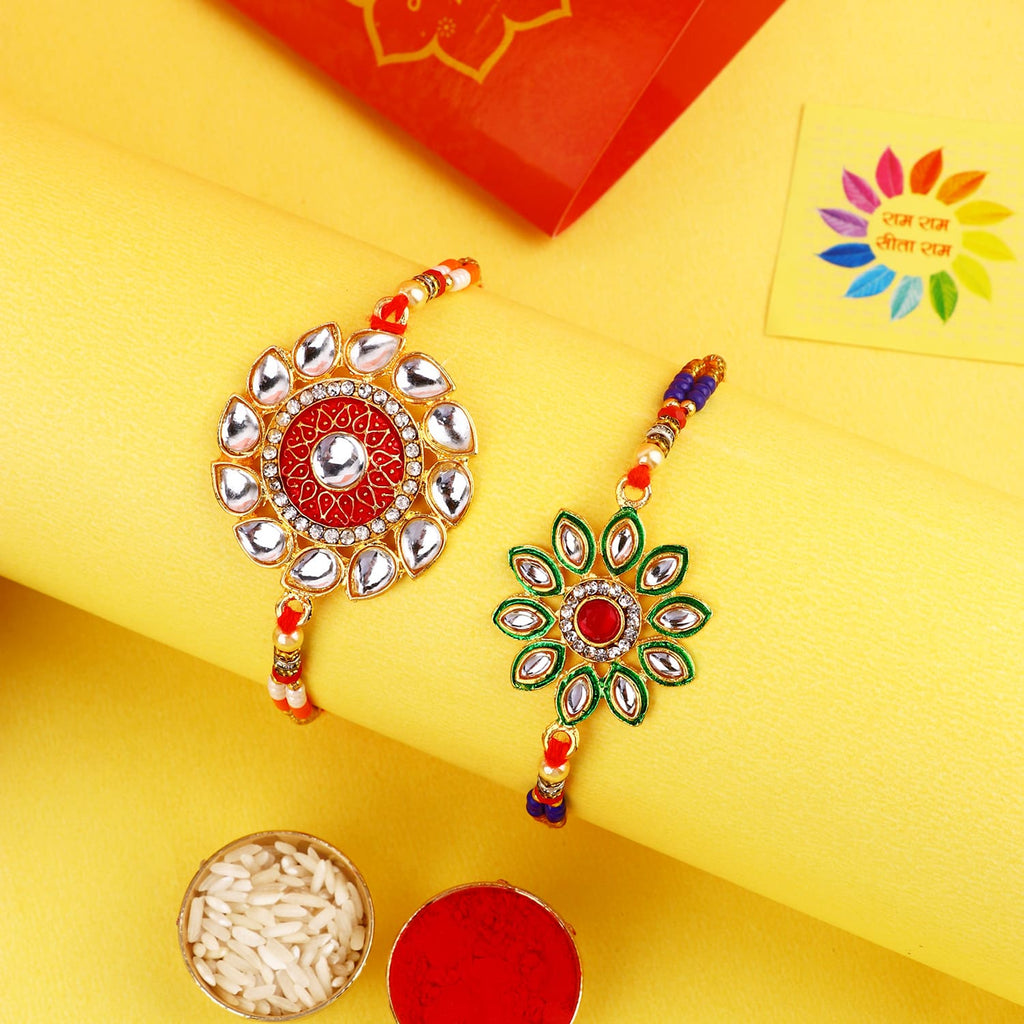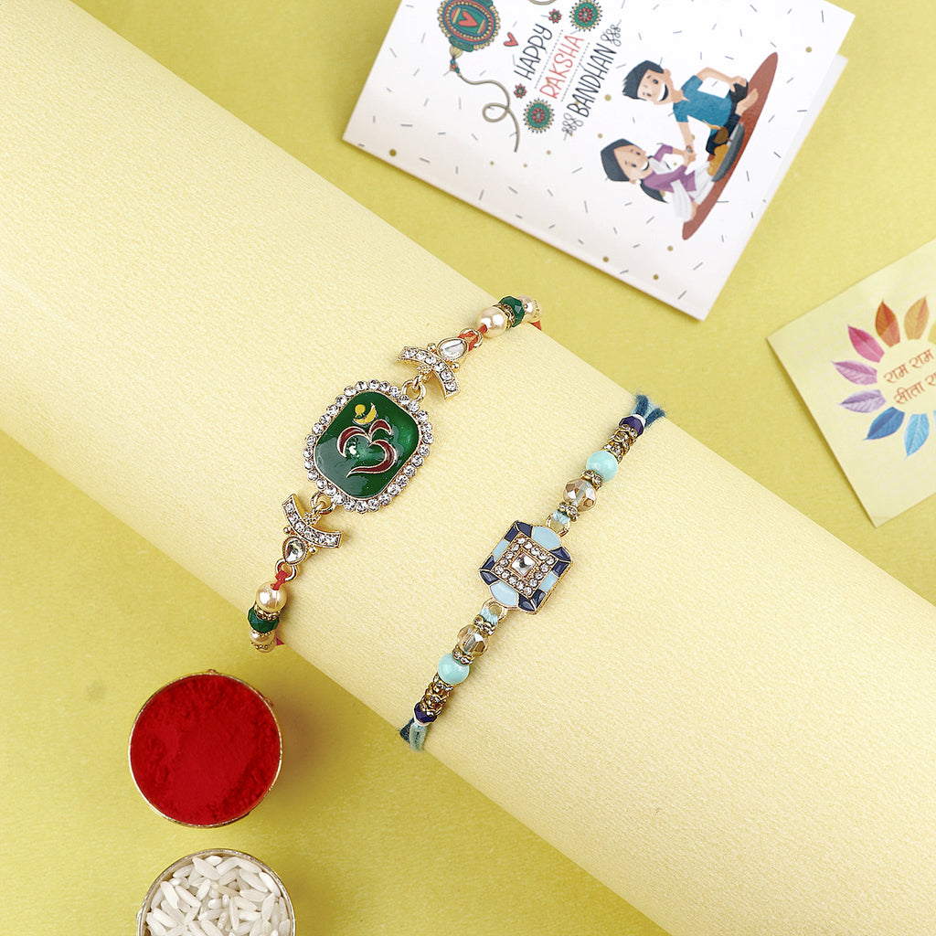Meenakari Rakhi Set of 2: Adorned with intricate Meenakari work, these rakhis exude the essence of cultural heritage and artistic finesse. The vibrant colors and delicate patterns make these rakhis a true celebration of sibling love.