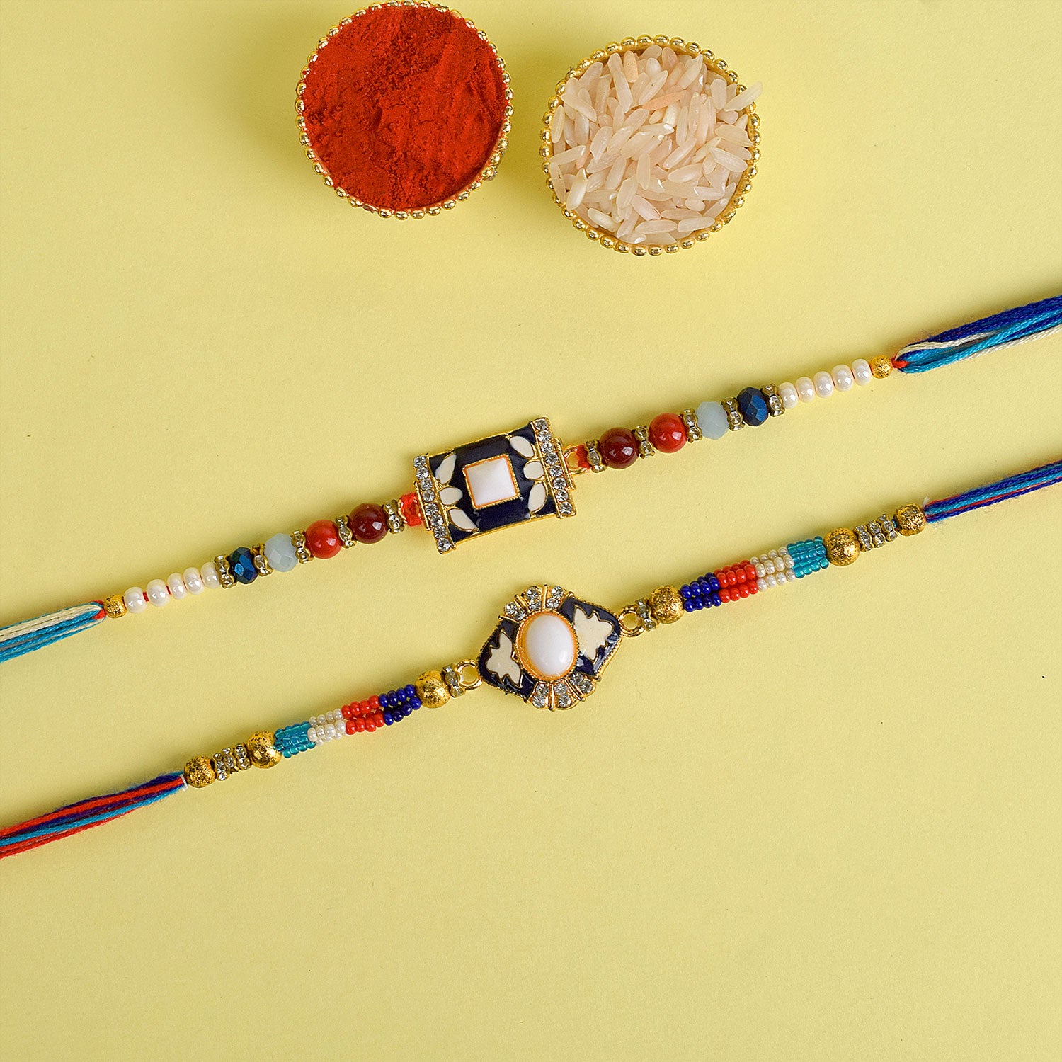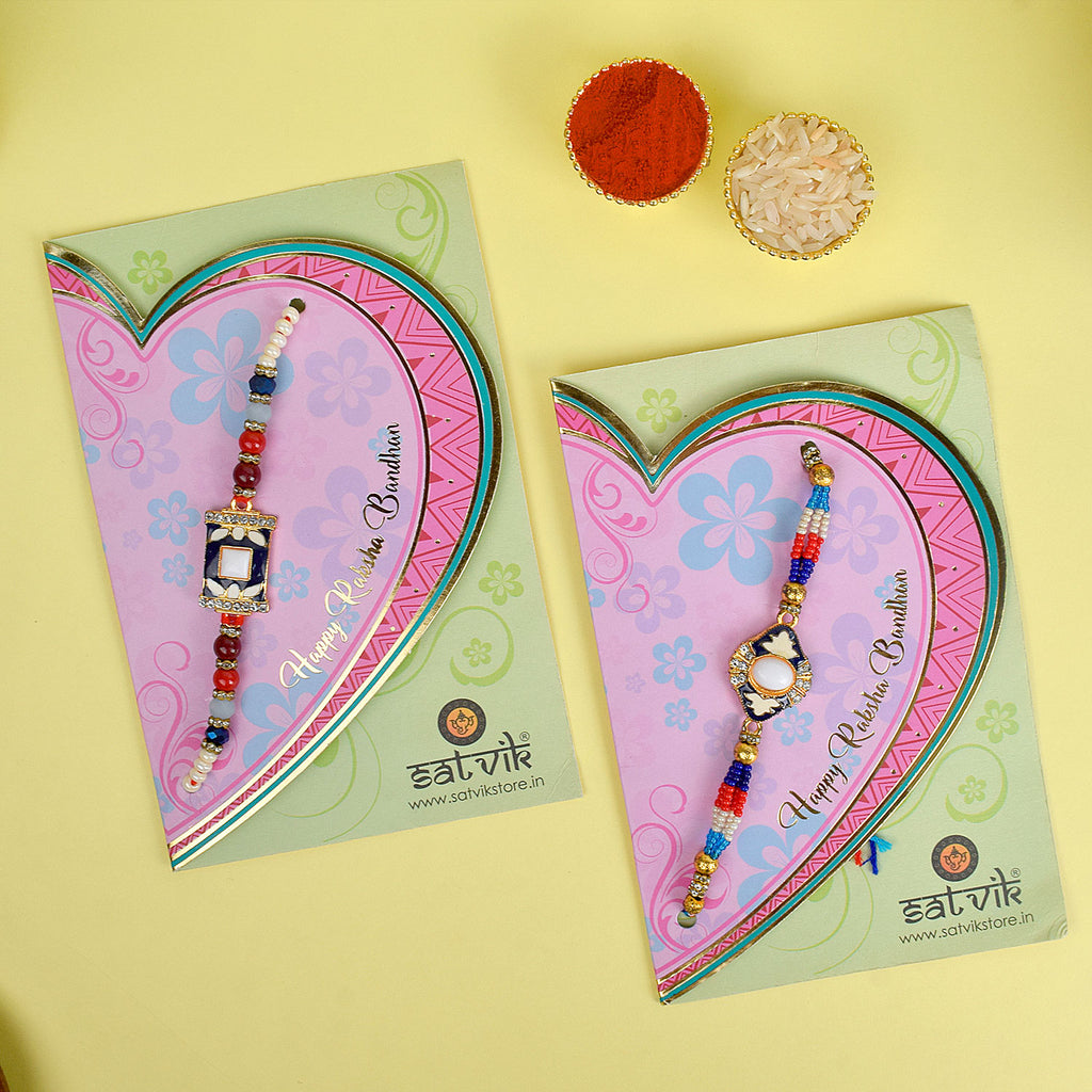 Beaded Bhaiya Rakhi Set of 2: Bedecked with colorful beads, these rakhis represent the joyous moments and cherished memories of growing up together. Embrace nostalgia and affection with this delightful beaded rakhi set.