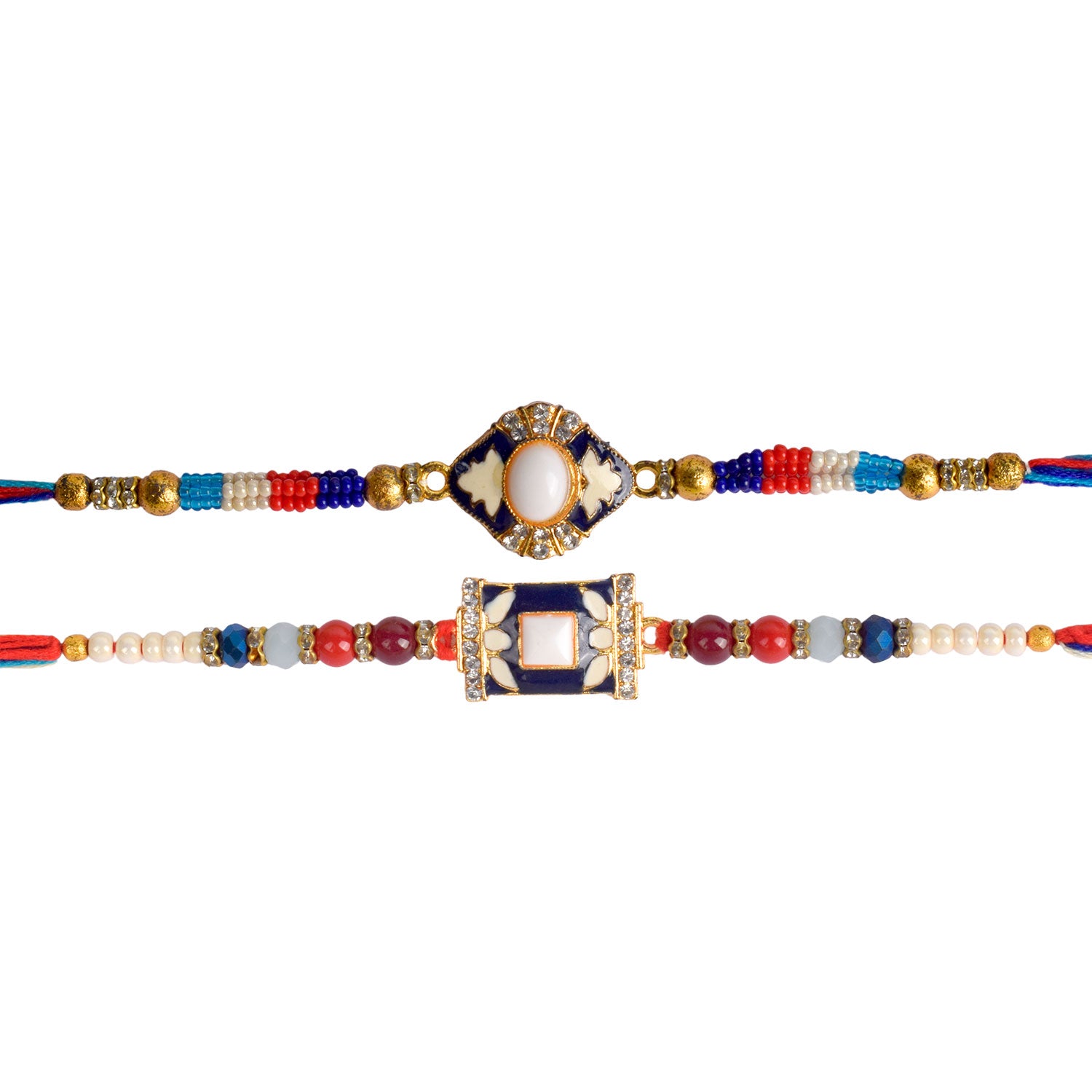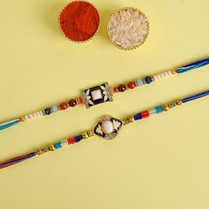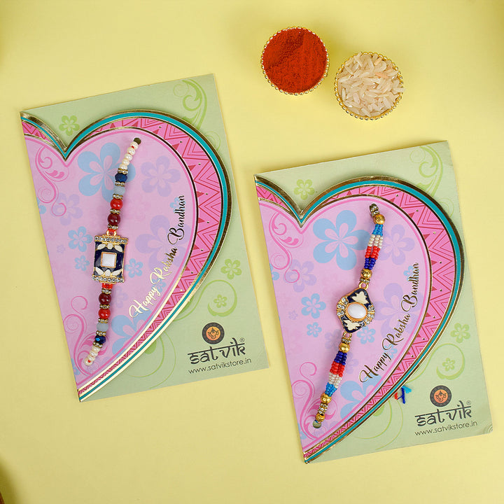 Meenakari Rakhi Set of 2: Adorned with intricate Meenakari work, these rakhis exude the essence of cultural heritage and artistic finesse. The vibrant colors and delicate patterns make these rakhis a true celebration of sibling love.