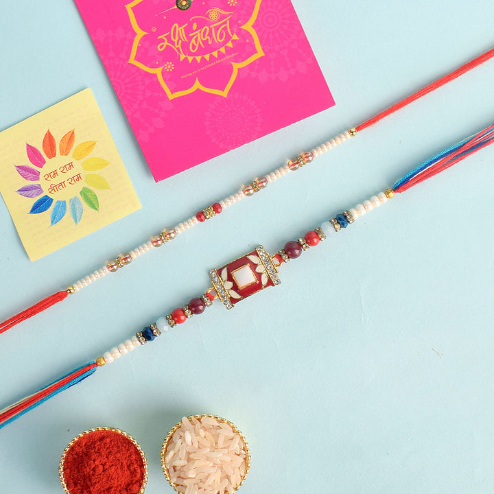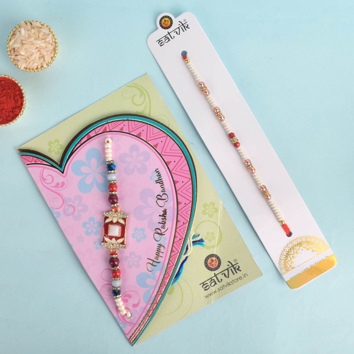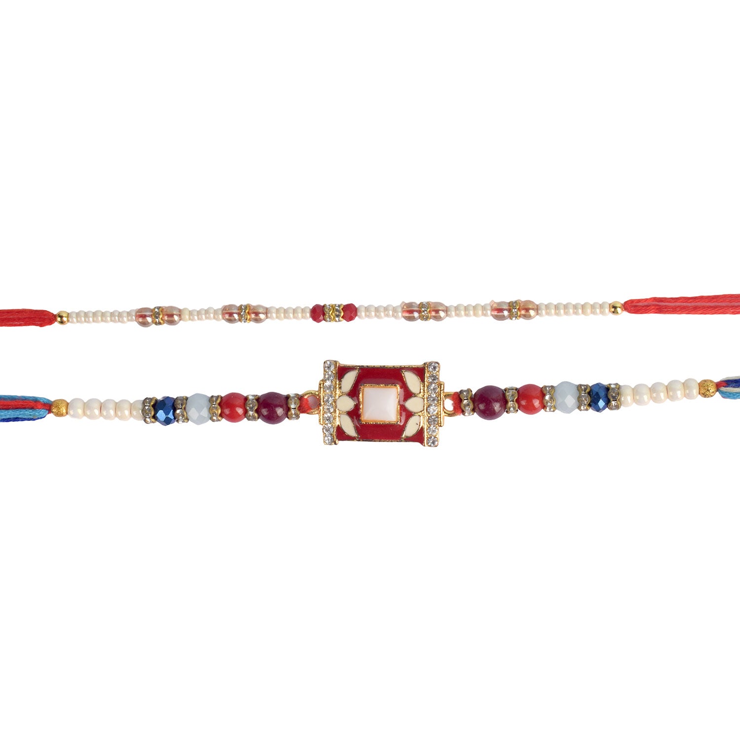 Beaded Bhaiya Rakhi Set of 2: Bedecked with colorful beads, these rakhis represent the joyous moments and cherished memories of growing up together. Embrace nostalgia and affection with this delightful beaded rakhi set.