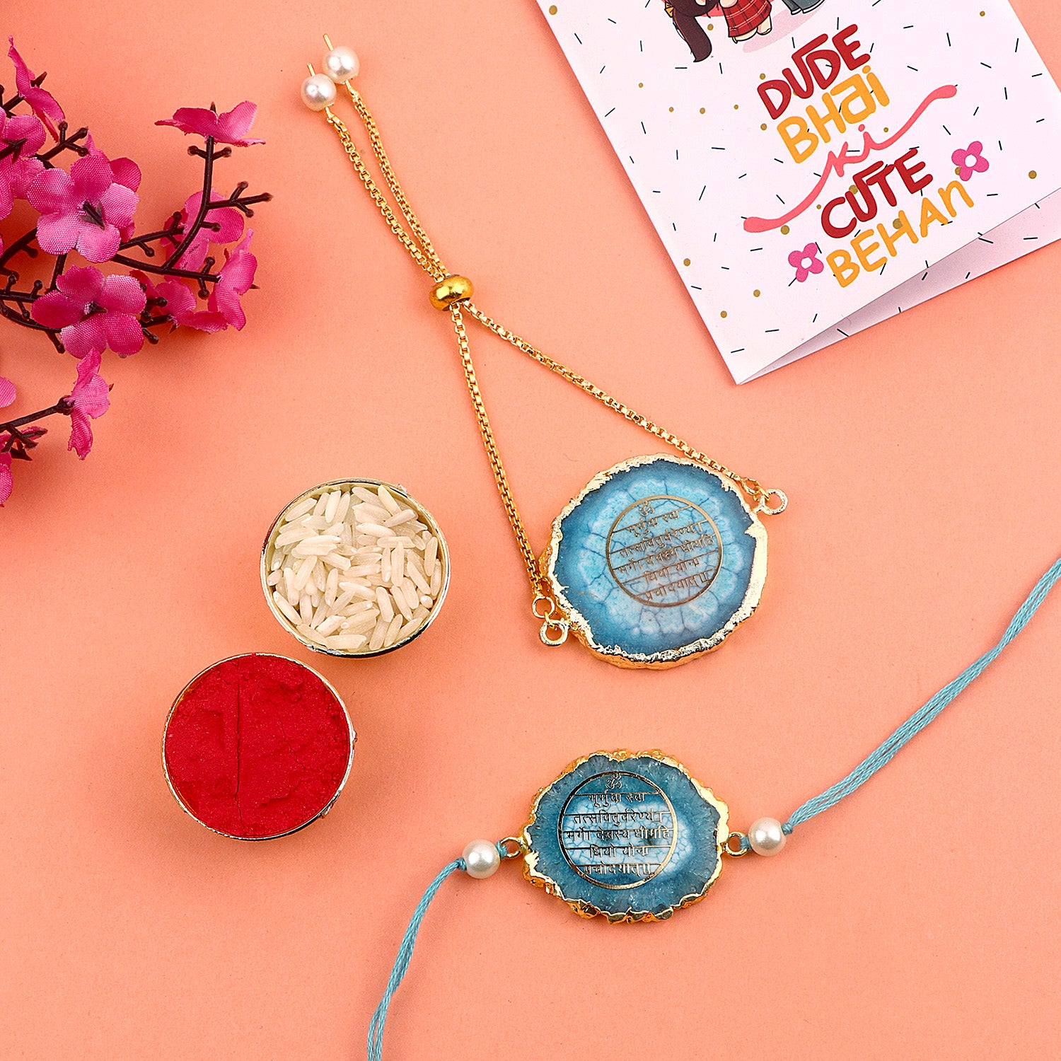 • Package: 1 Pc Agate Stone Gayatri Mantra Rakhi, Roli Akshat, Greeting Card