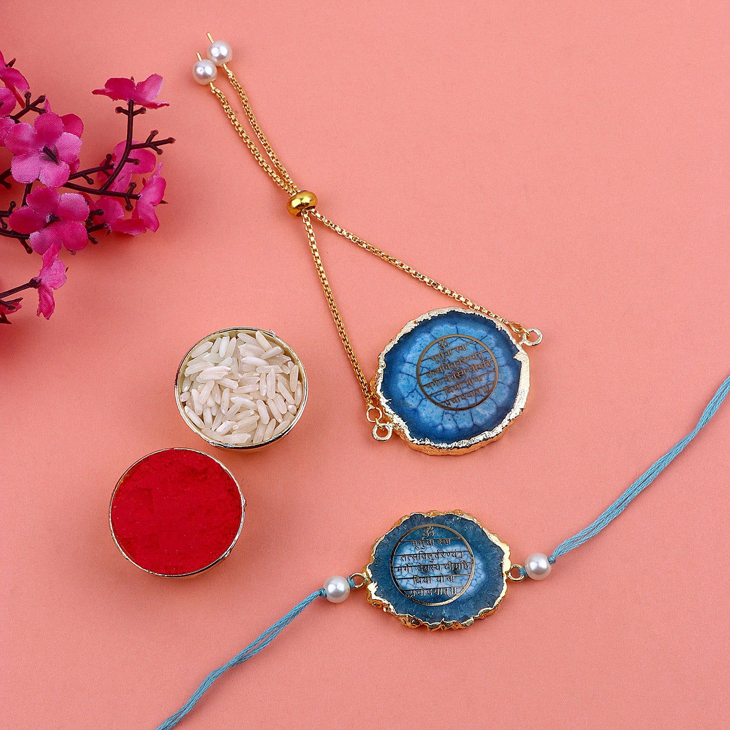 • Item Name: Gilded Devotion: Agate Stone Rakhi with Gayatri Mantra for Bhaiya Bhabhi