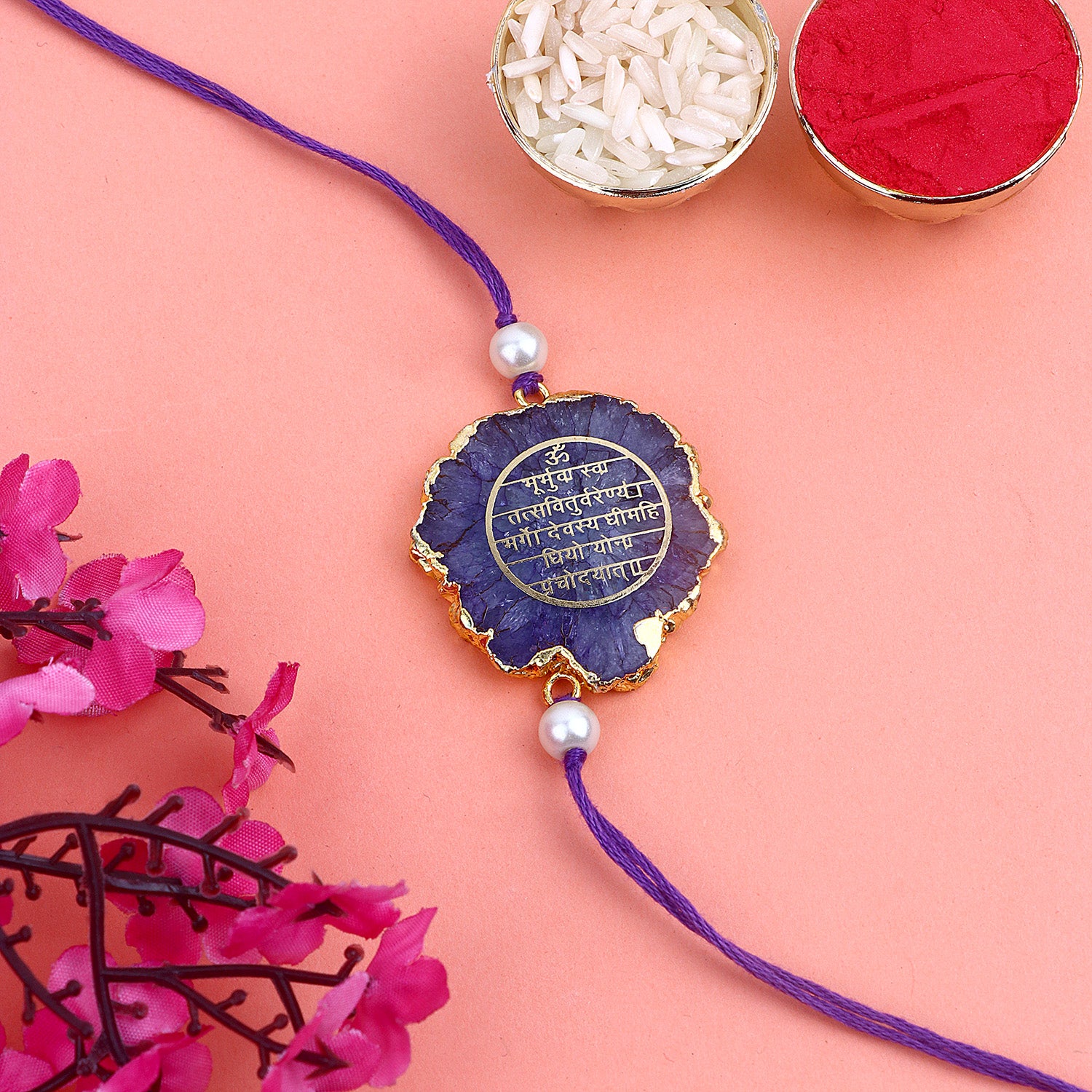 • About Product: The Agate Stone Gayatri Mantra Rakhi is meticulously crafted with utmost care and attention to detail. The centerpiece of the Rakhi is a stunning Agate stone, delicately embedded in the design. Surrounding the stone are sacred symbols and motifs that symbolize protection, strength, and spiritual growth.