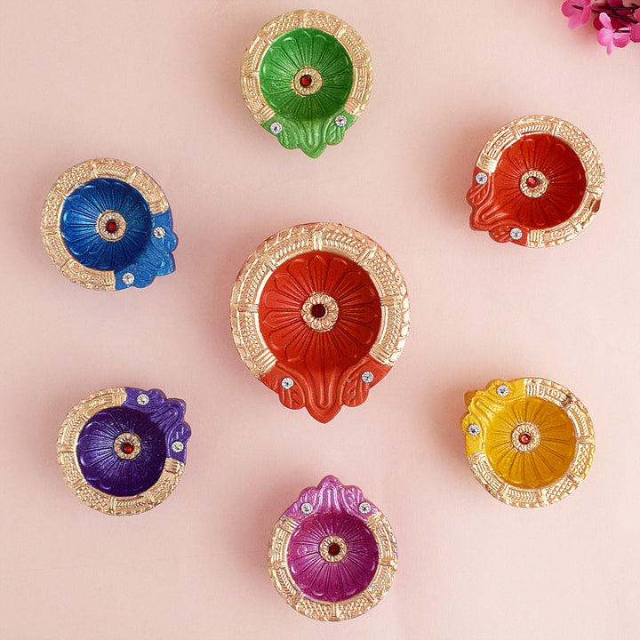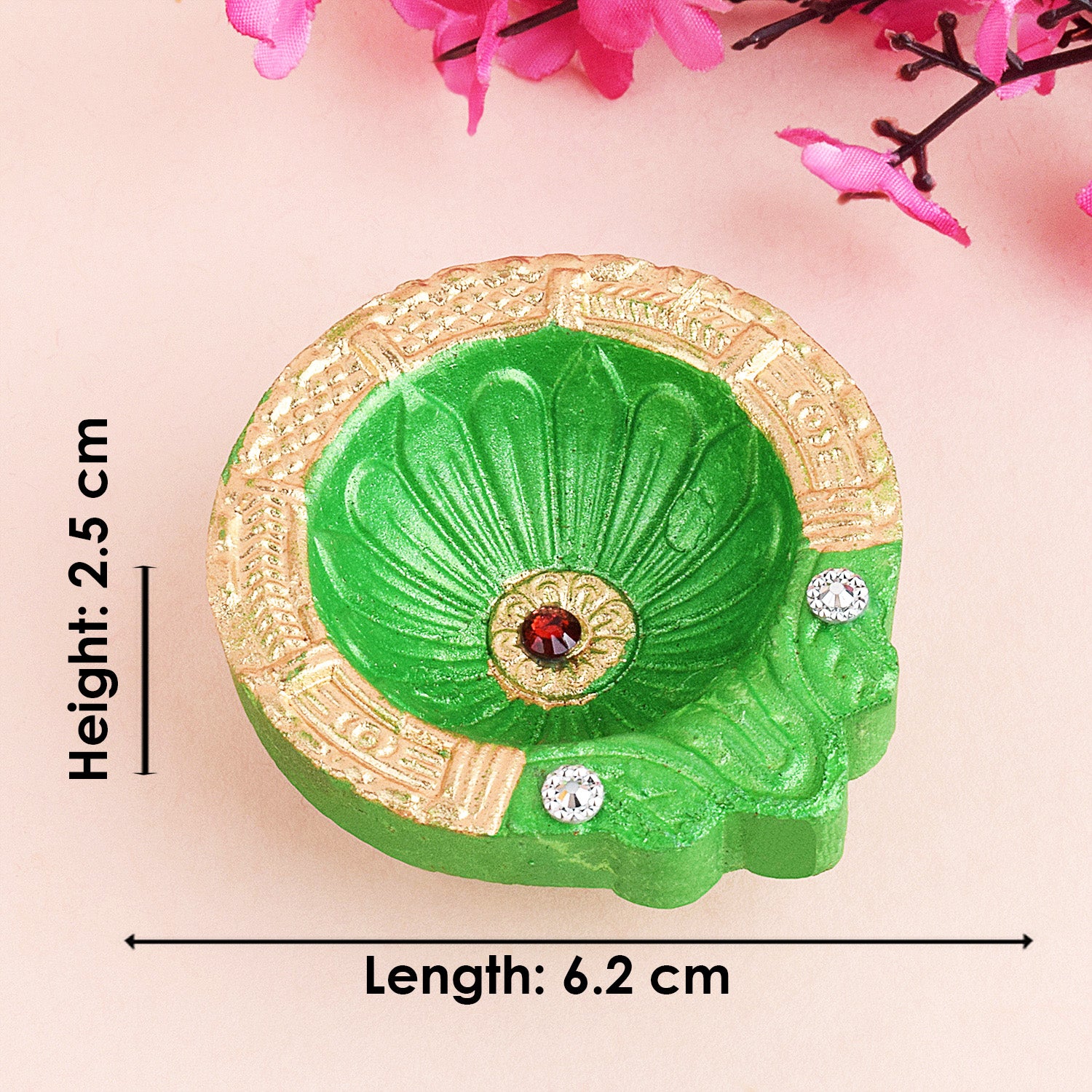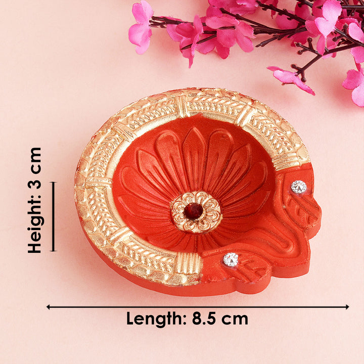 • Product Details: Material: Clay/Terracotta Dimensions: Regular Diya Height: 2.5cm, Length: 6.2cm, Large Diya Height: 3cm, Length: 8.5cm, Weight: 700gram, Finish Type: Glossy.
