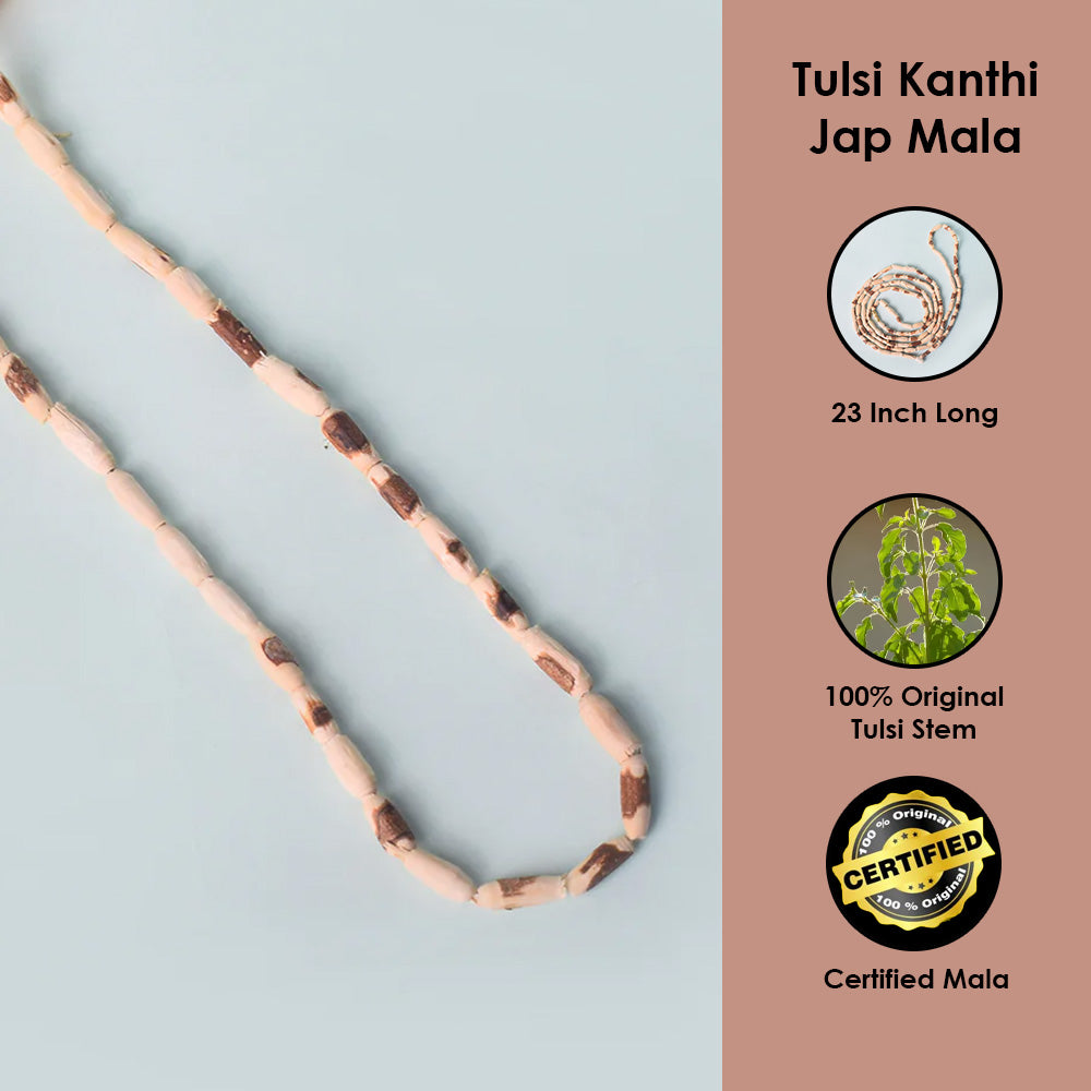 A Tulsi Mala is a string of beads made from the wood of the sacred Tulsi plant (Ocimum sanctum). It is widely used in Hinduism, Jainism, and Buddhism for chanting (Japa) and wearing as a protective necklace. The power of Tulsi Mala is believed to enhance spirituality, bring inner peace, and protect the wearer from negative energies.