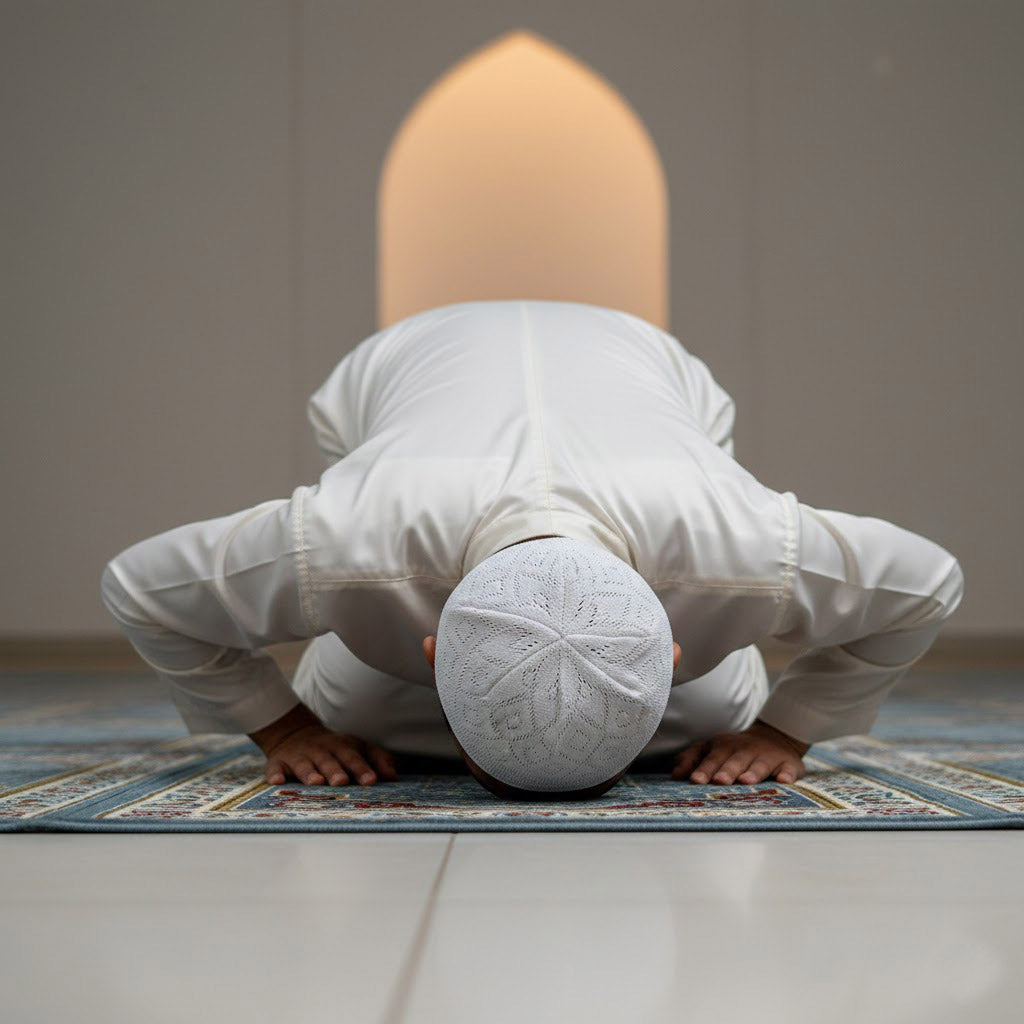 Wearing a Muslim cap during prayer symbolizes modesty, discipline, and spiritual focus, helping devotees maintain concentration and reverence while offering Salah.