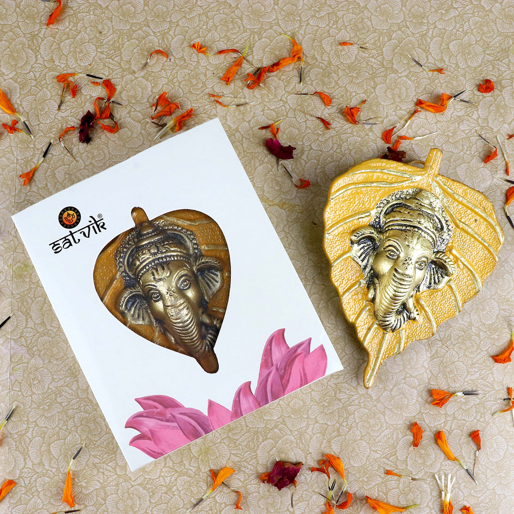 Description:  Satvik Presents Designer Lord Ganesha On Leaf which is ideal for wall Hanging Decor for homes, offices, and Mandir. This Ganpati Sculpture has detailed work and is made up of Premium Quality Material, Comes with Premium Gift Packing. Ganesha is a Symbol of the God of Success, Patron Of Music, Remover of Obstacles, and many other aspects. The Ganesha with a peepal leaf at the back is the most suitable Ganesha posture that ensures good luck and prosperity.