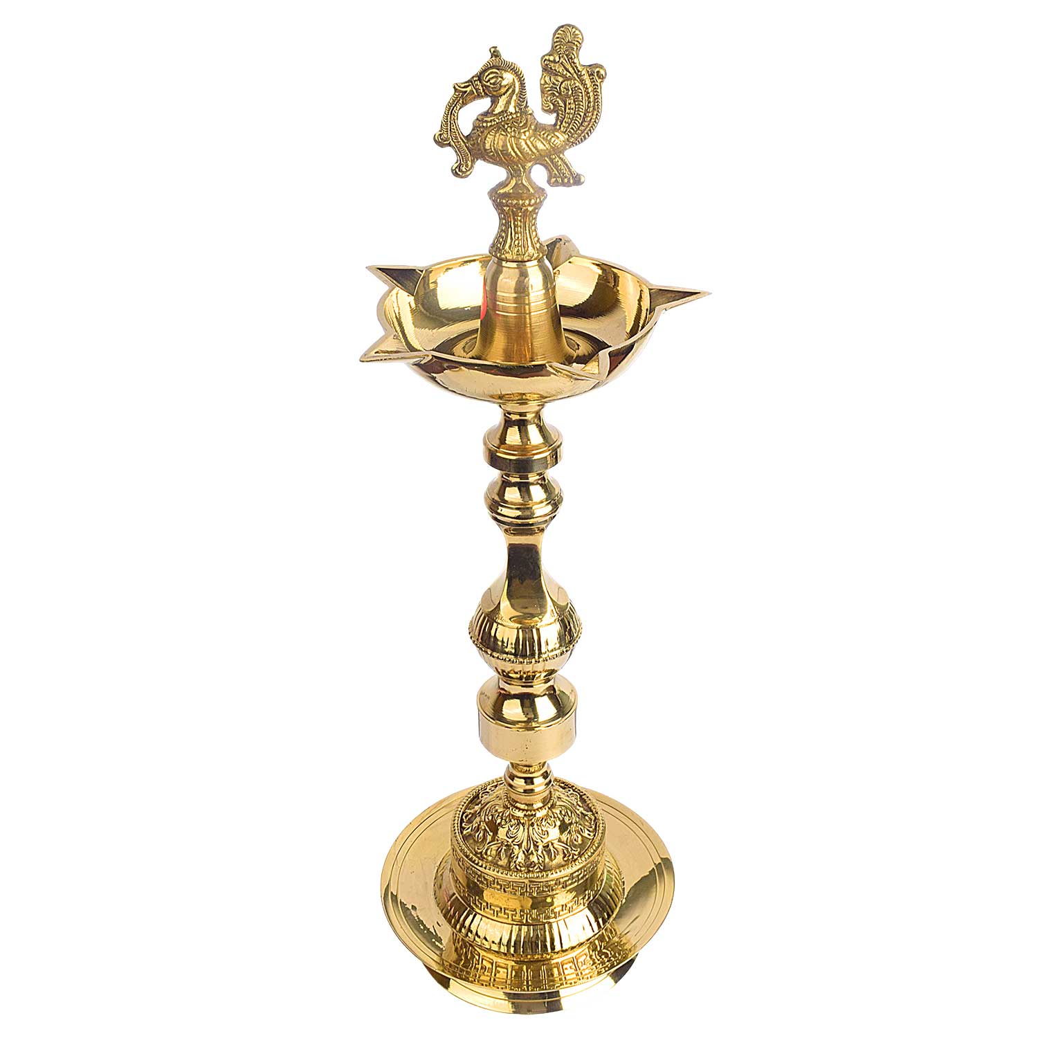 • Item Name:  19 Inch 1 Step Embossed Peacock Kerala Stand Deepam