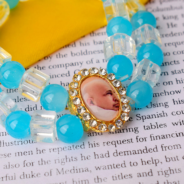 Our Guruji bracelet is a tangible symbol of divine connection. Crafted with care and reverence, it is designed to be worn close to your heart, serving as a constant reminder of Guruji's presence. The bracelet is adorned with sacred symbols and gemstones that hold spiritual significance, channeling positive energy and protection.