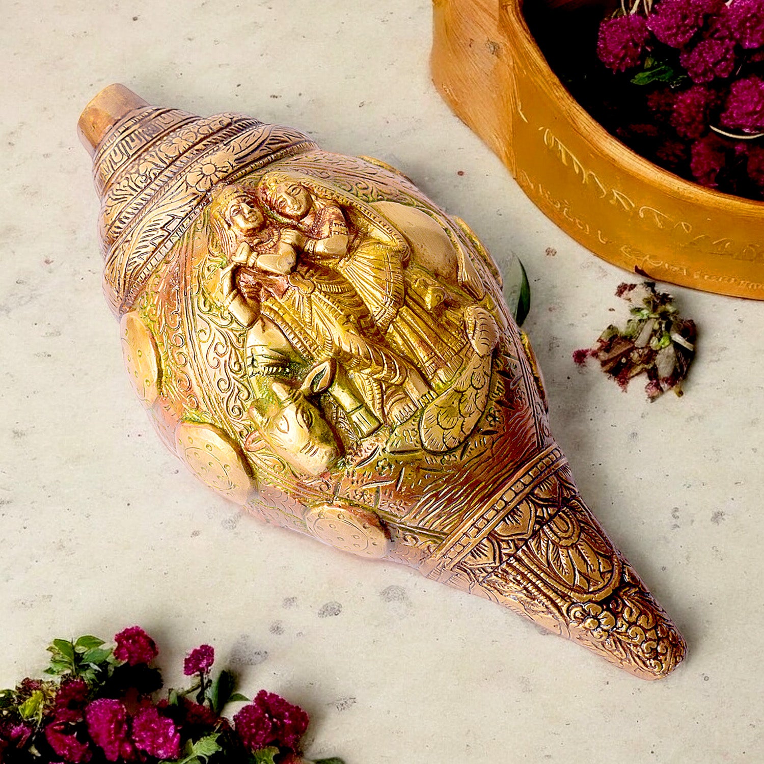 Get Brass Shankh with Divine Carvings of Radha Krishna | Satvik – satvikstore.in