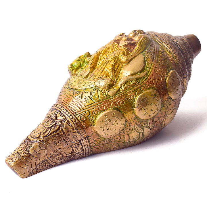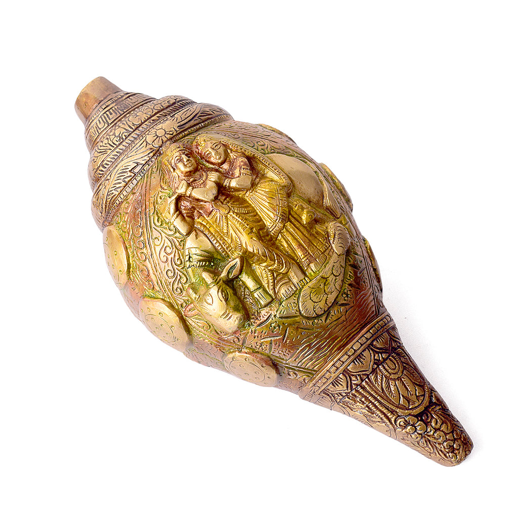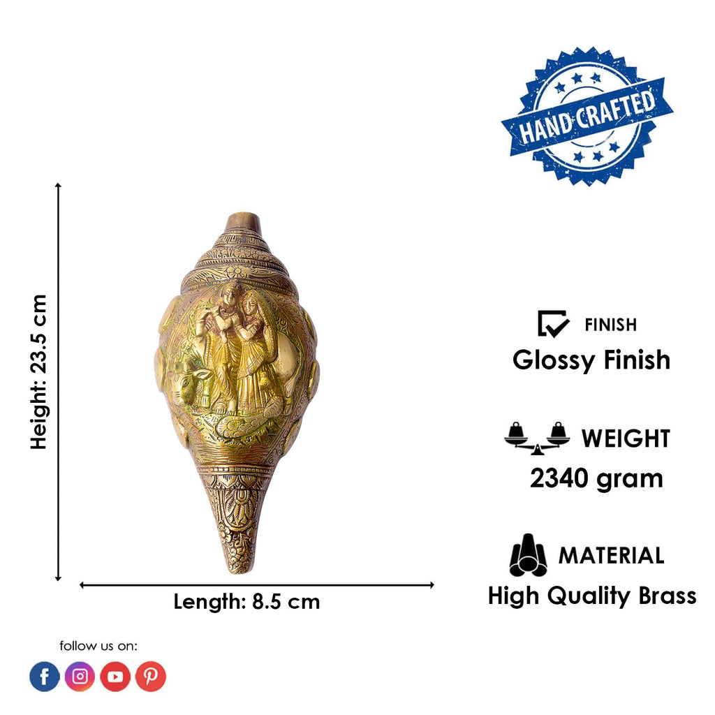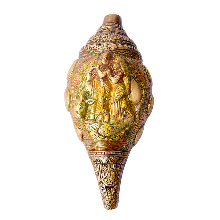• Item Name: Brass Shankh with Divine Carvings of Radha Krishna Shankh