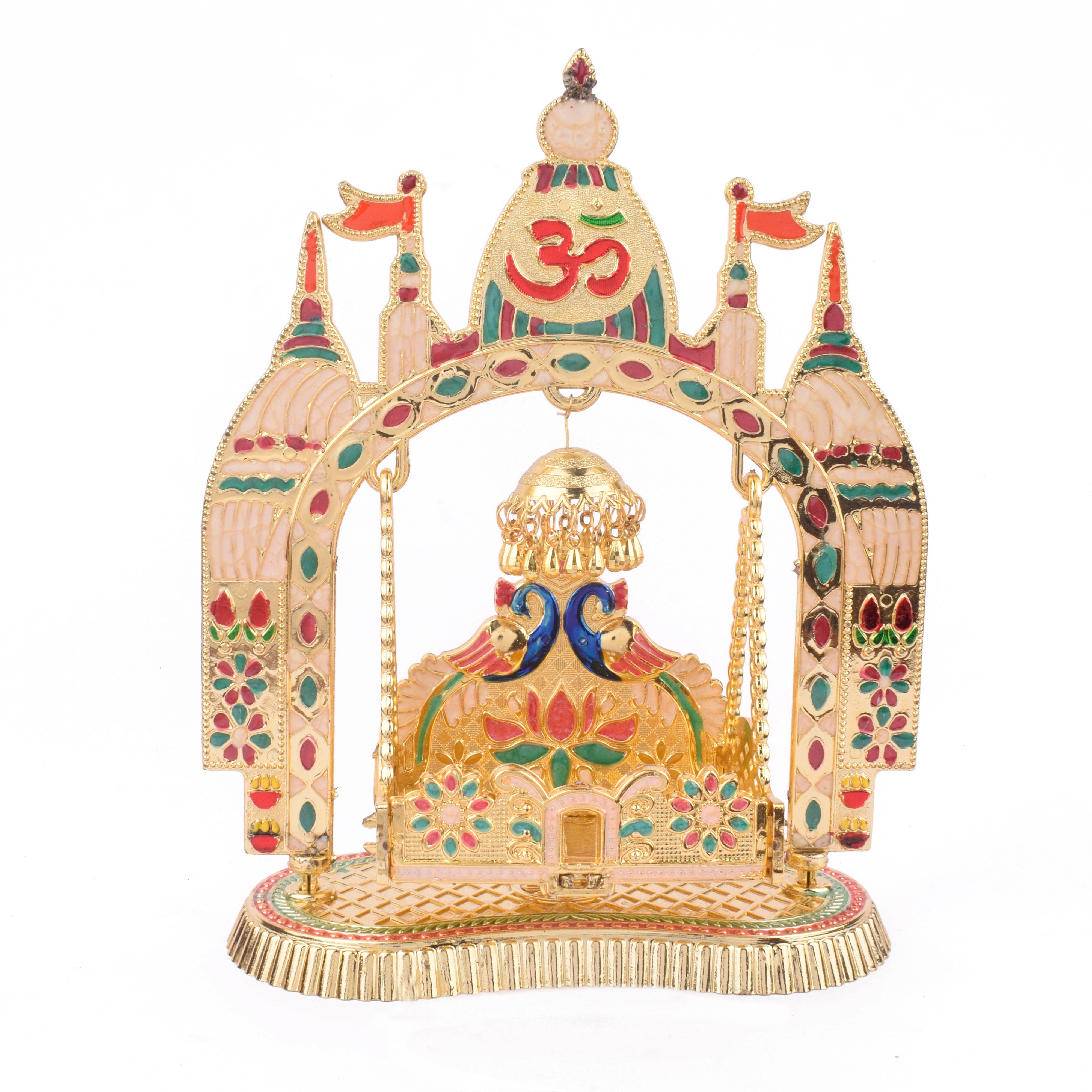 temple style laddu gopal jhula | charming bal gopal swing | kanha temple cradle | laddu gopal jhula decoration | golden pooja swing | krishna swing for mandir | traditional bal gopal jhula | home mandir accessories | ornate krishna cradle | decorative pooja jhula