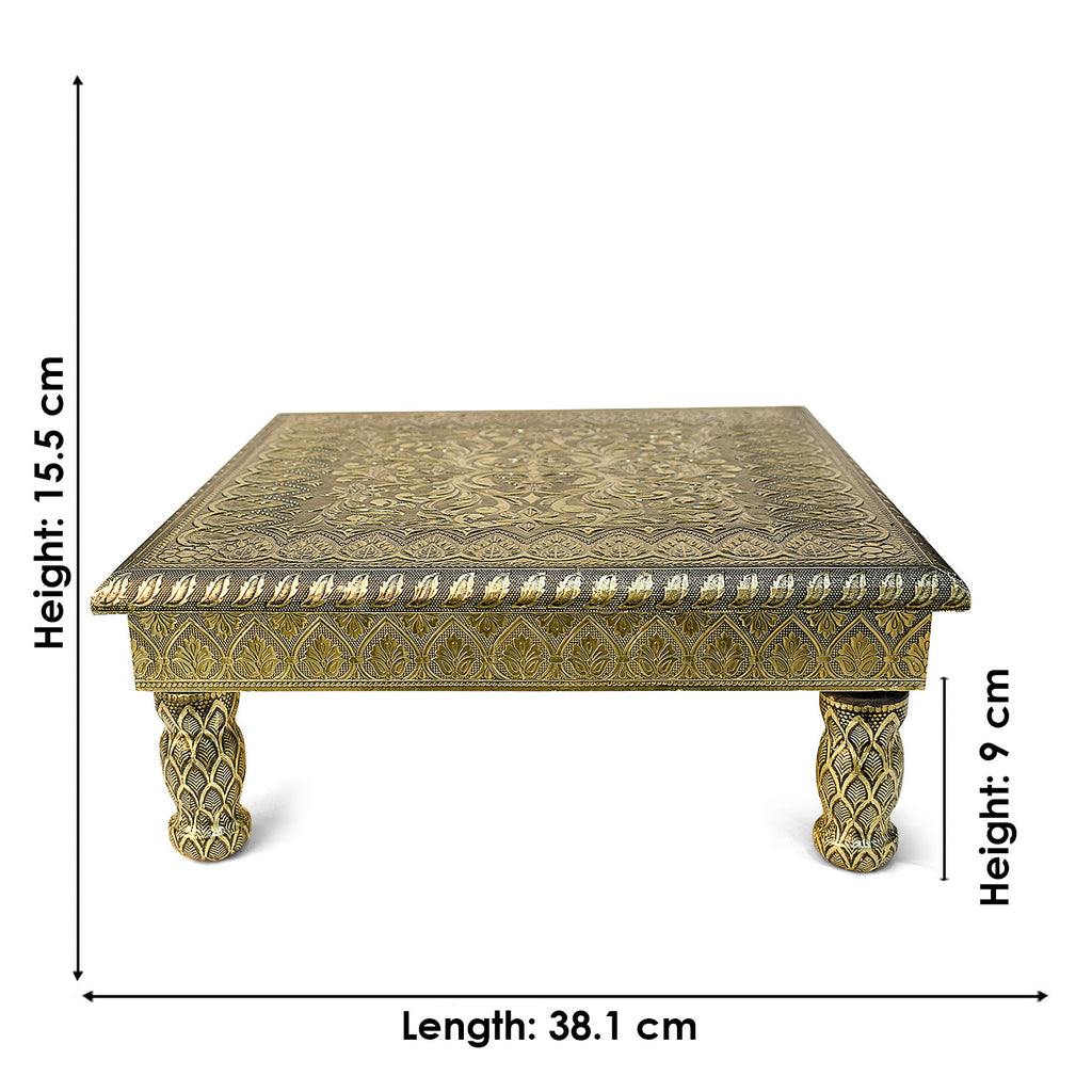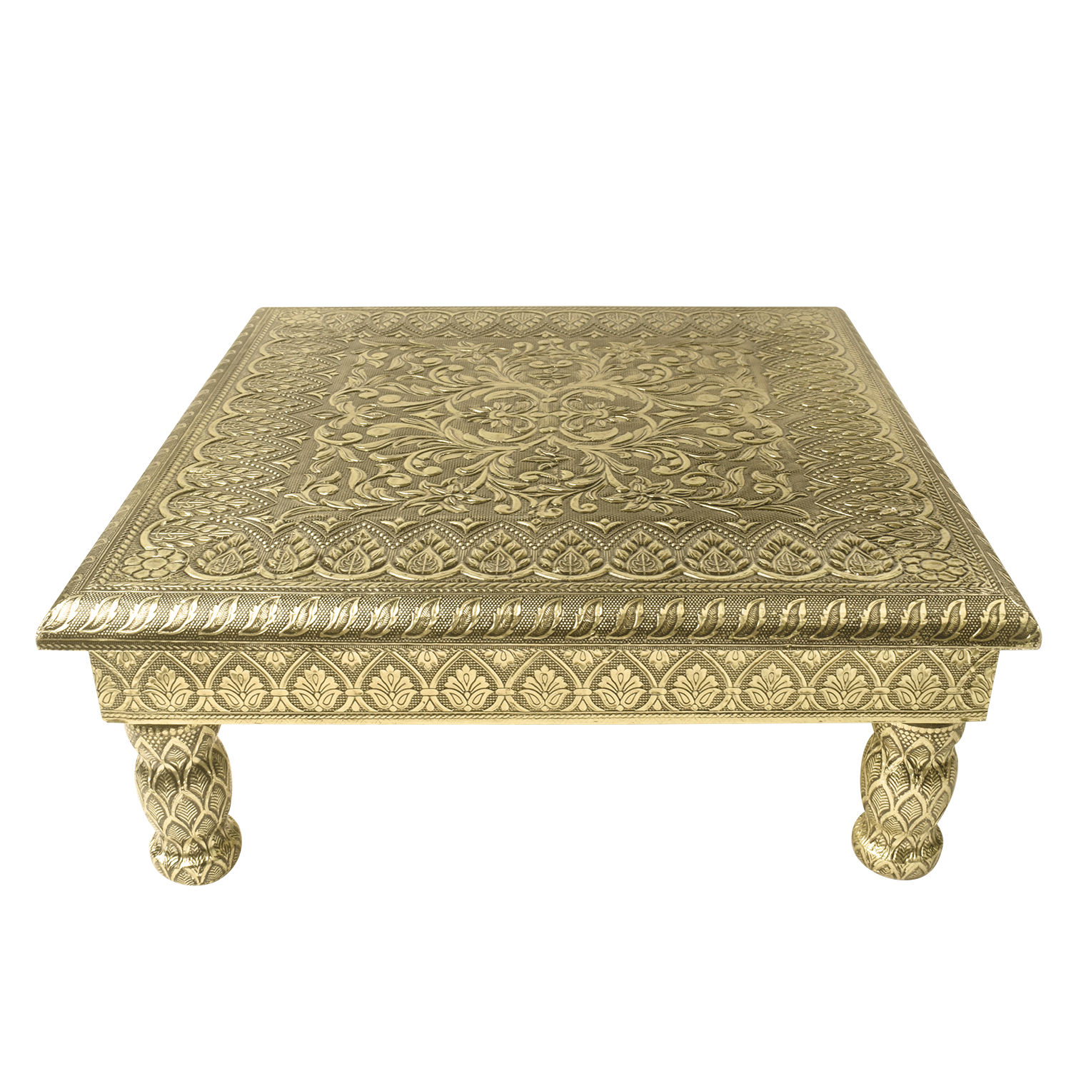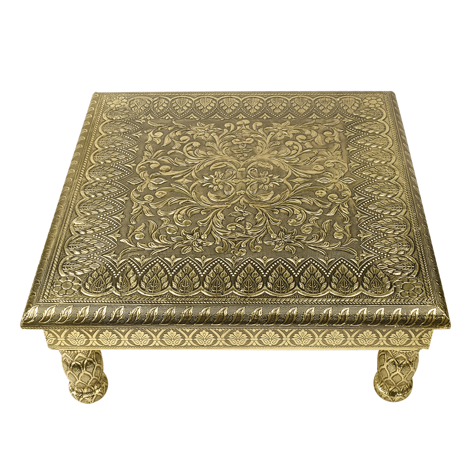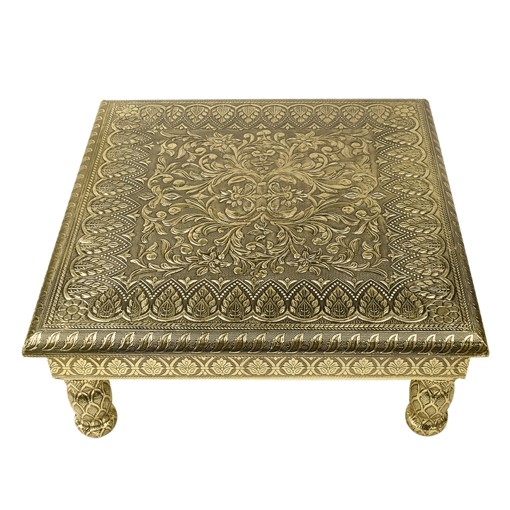 • Description:Β The embossed design creates a textured opulence, elevating the aesthetic appeal of the chowki. Each detail is a work of art, showcasing the dedication and skill of the artisan. This handcrafted piece serves not only as a sturdy base for religious idols but also as a decorative accent that enhances the overall ambiance of your sacred space.