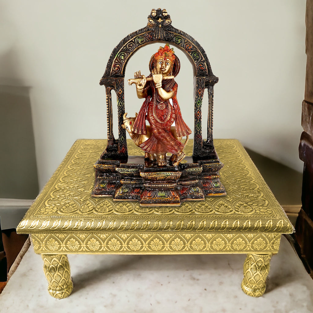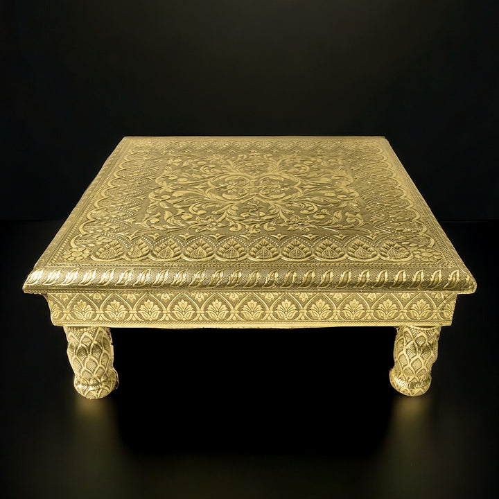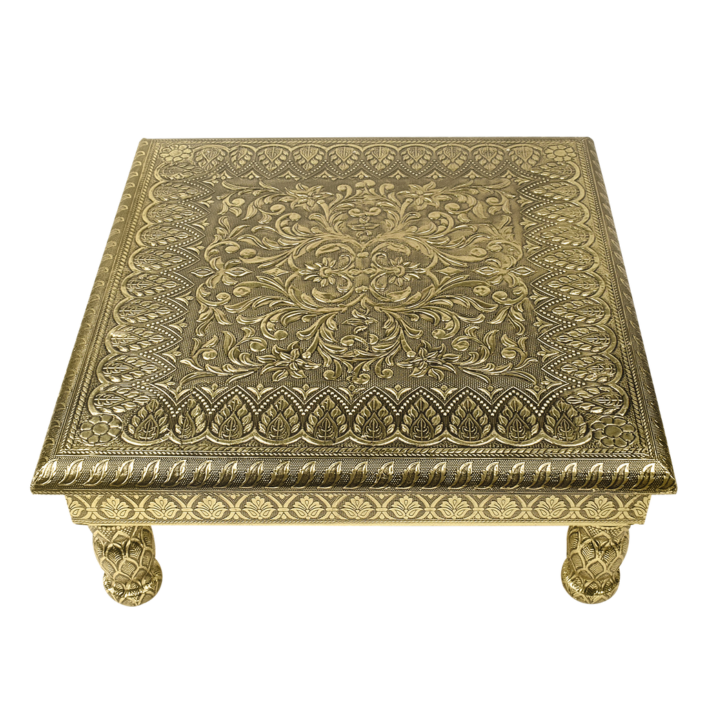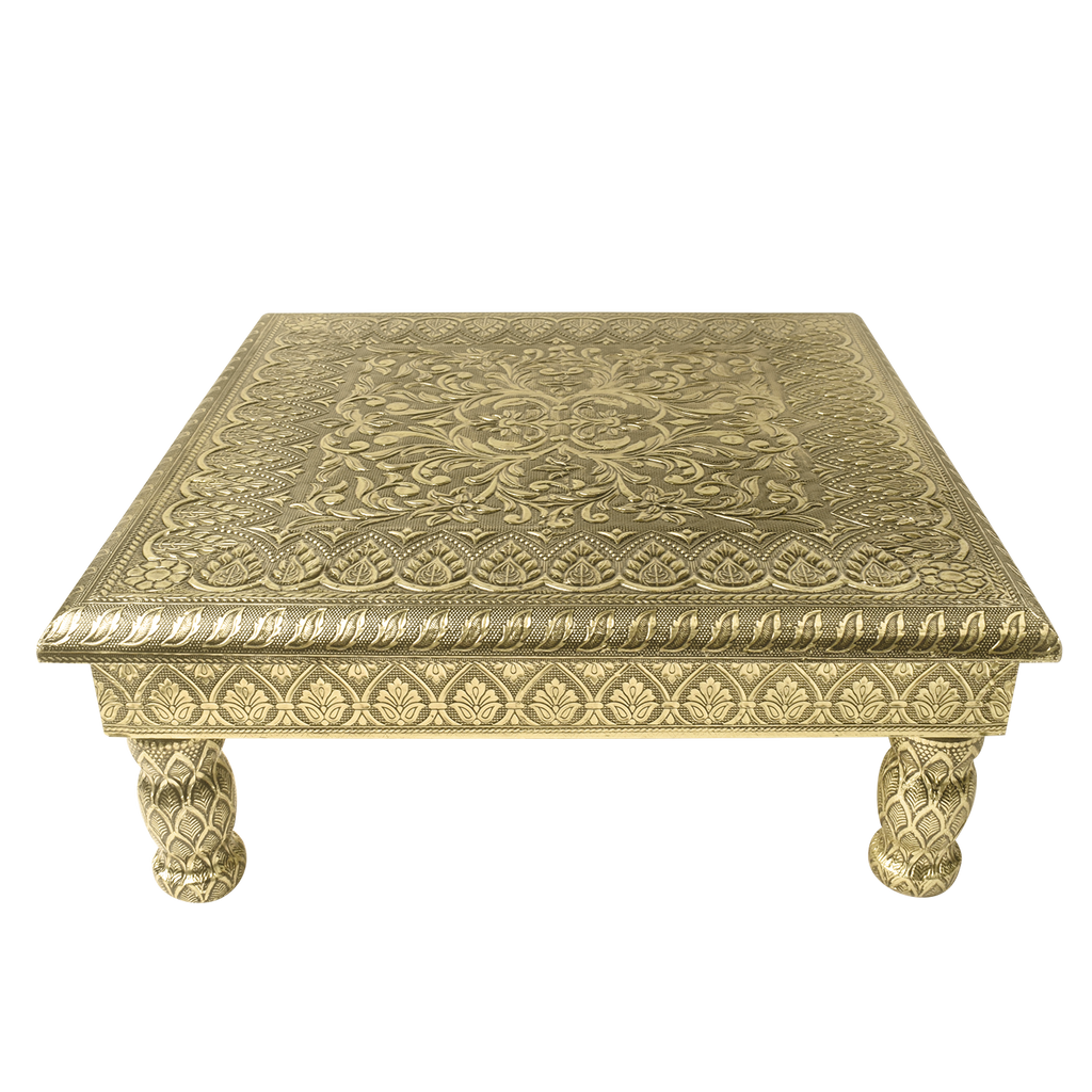 • Description:Β The embossed design creates a textured opulence, elevating the aesthetic appeal of the chowki. Each detail is a work of art, showcasing the dedication and skill of the artisan. This handcrafted piece serves not only as a sturdy base for religious idols but also as a decorative accent that enhances the overall ambiance of your sacred space.