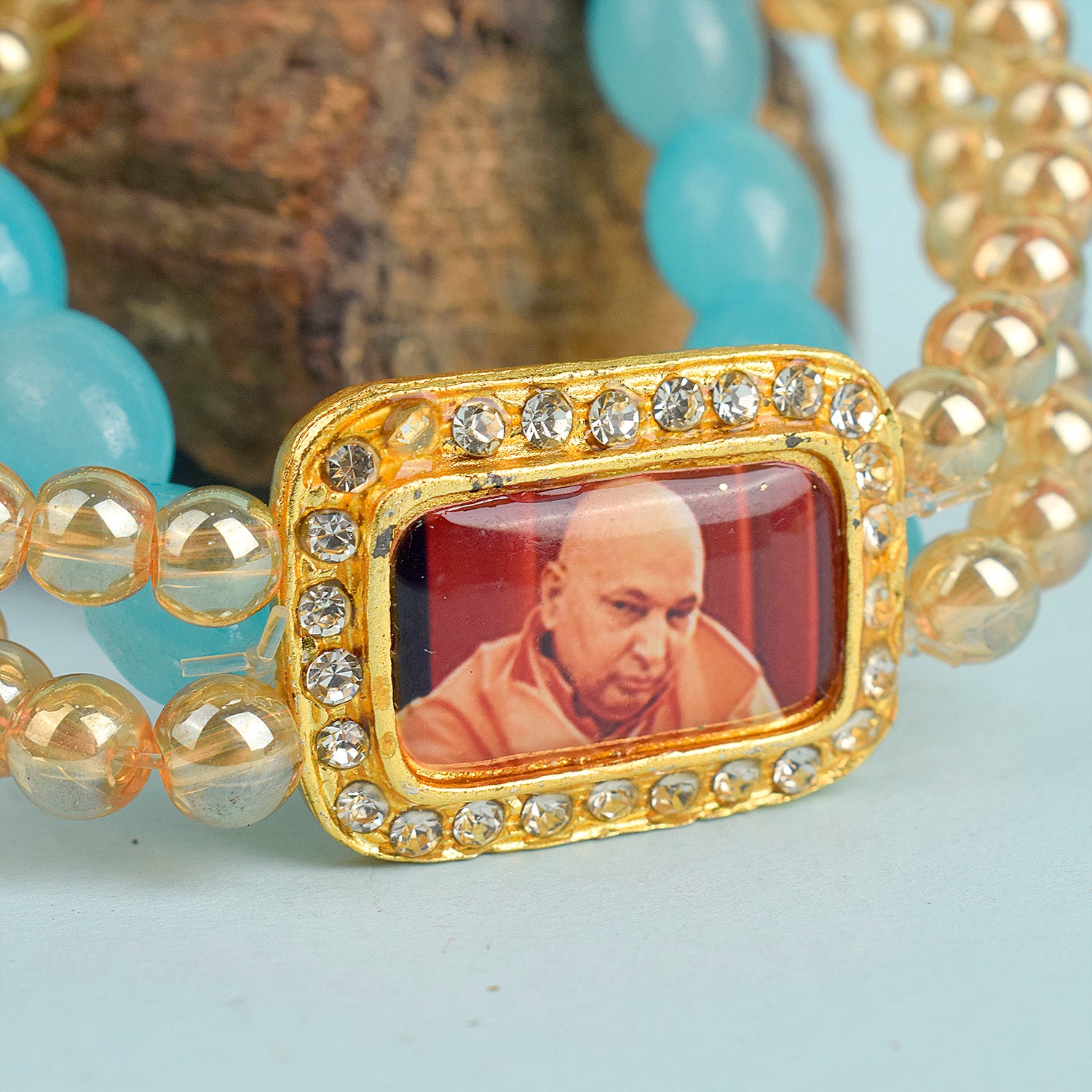 golden clear guruji bracelet | triple layer bracelet | baby blue beads bracelet | pastel guruji bracelet | elegant guruji swaroop bracelet | stylish daily wear bracelet | guruji bracelet for men and women | spiritual bracelet india | jai guruji bracelet | handmade spiritual jewellery | pooja return gift | satvikstore bracelet | soft spiritual bracelet | multi layer guruji bracelet | graceful spiritual jewellery | baby blue spiritual bracelet | india spiritual brand