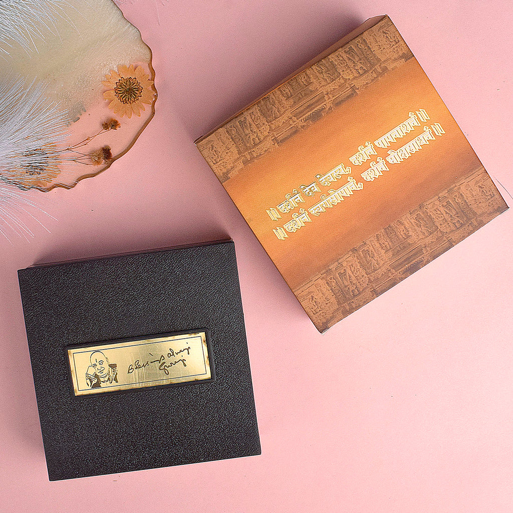 About Product:Β  This box has a Plated Charan paduka. It Consist of Guruji Swaroop. Guruji Signature over the top of the Box. It is also called the Devotional Prayer Box. It has Beautiful Gift Packing all around the box so that this can be a perfect gifting Idea for any Religious Occasions.