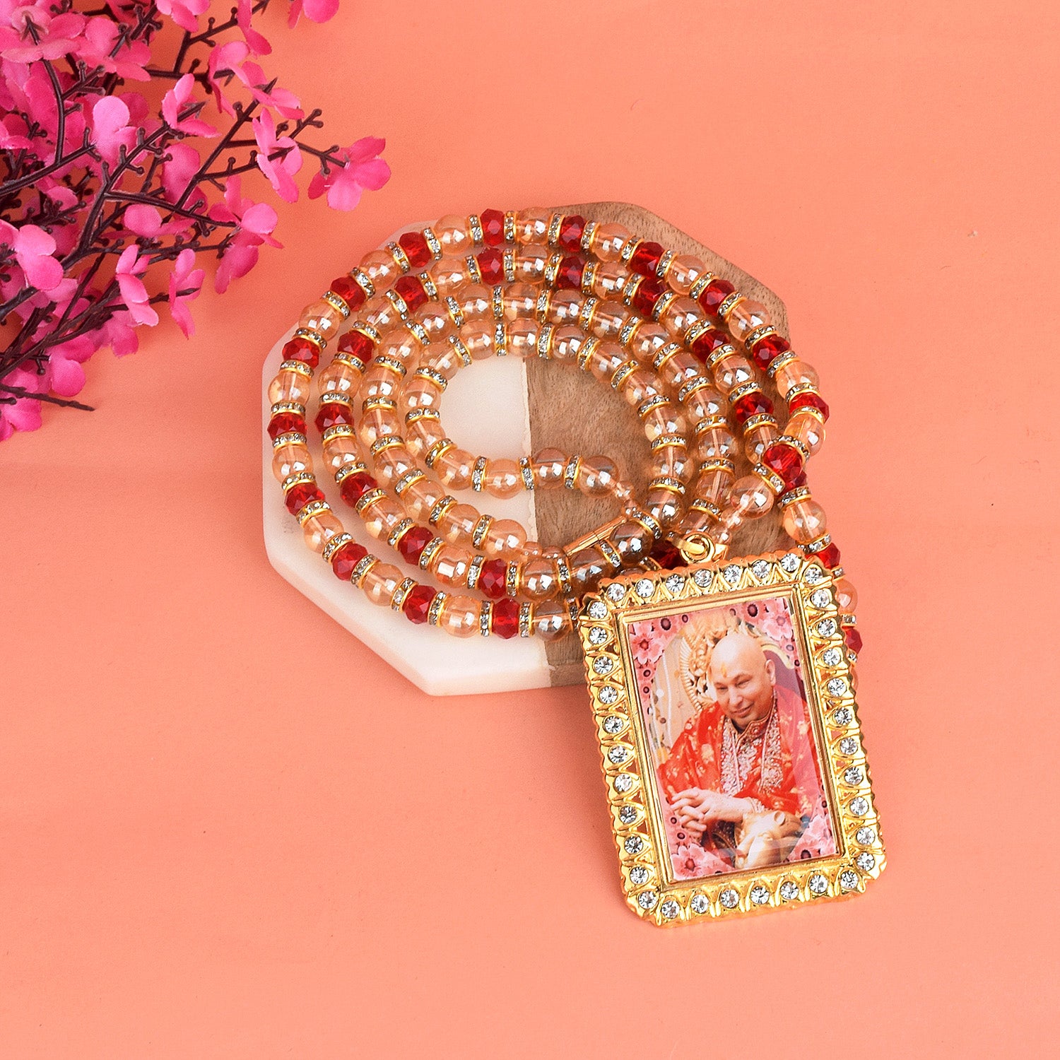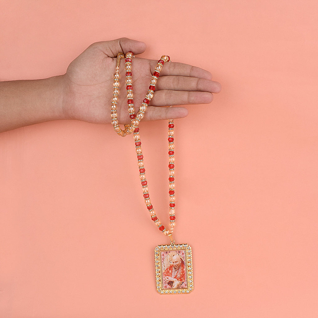 The Guruji neck mala is a sacred adornment that carries the energy of Guruji's blessings. Handmade with devotion, this mala comprises prayer beads and a Guruji pendant. When worn, it fosters a sense of inner peace and spiritual harmony, aiding in meditation and connecting you to Guruji's teachings.