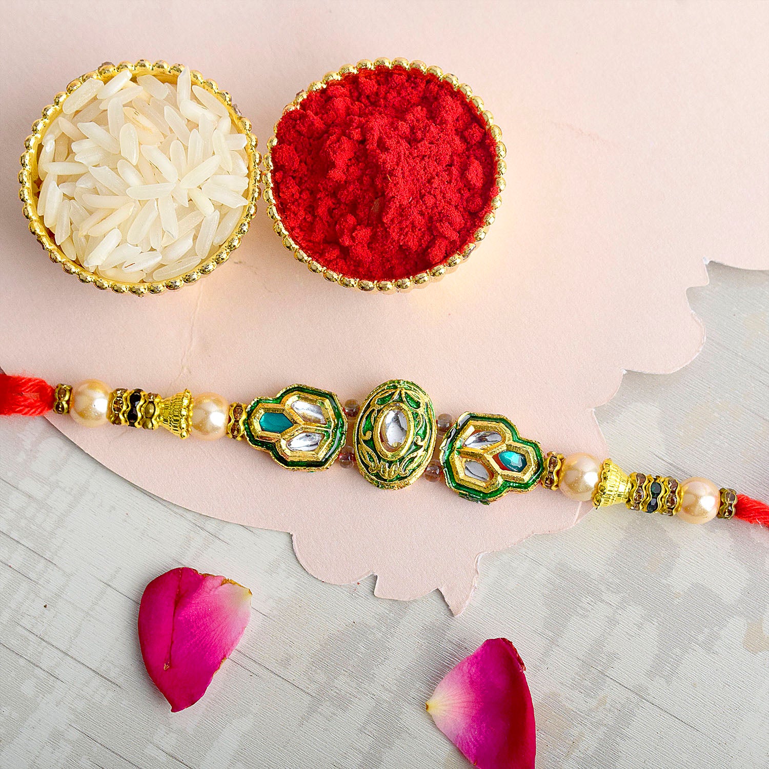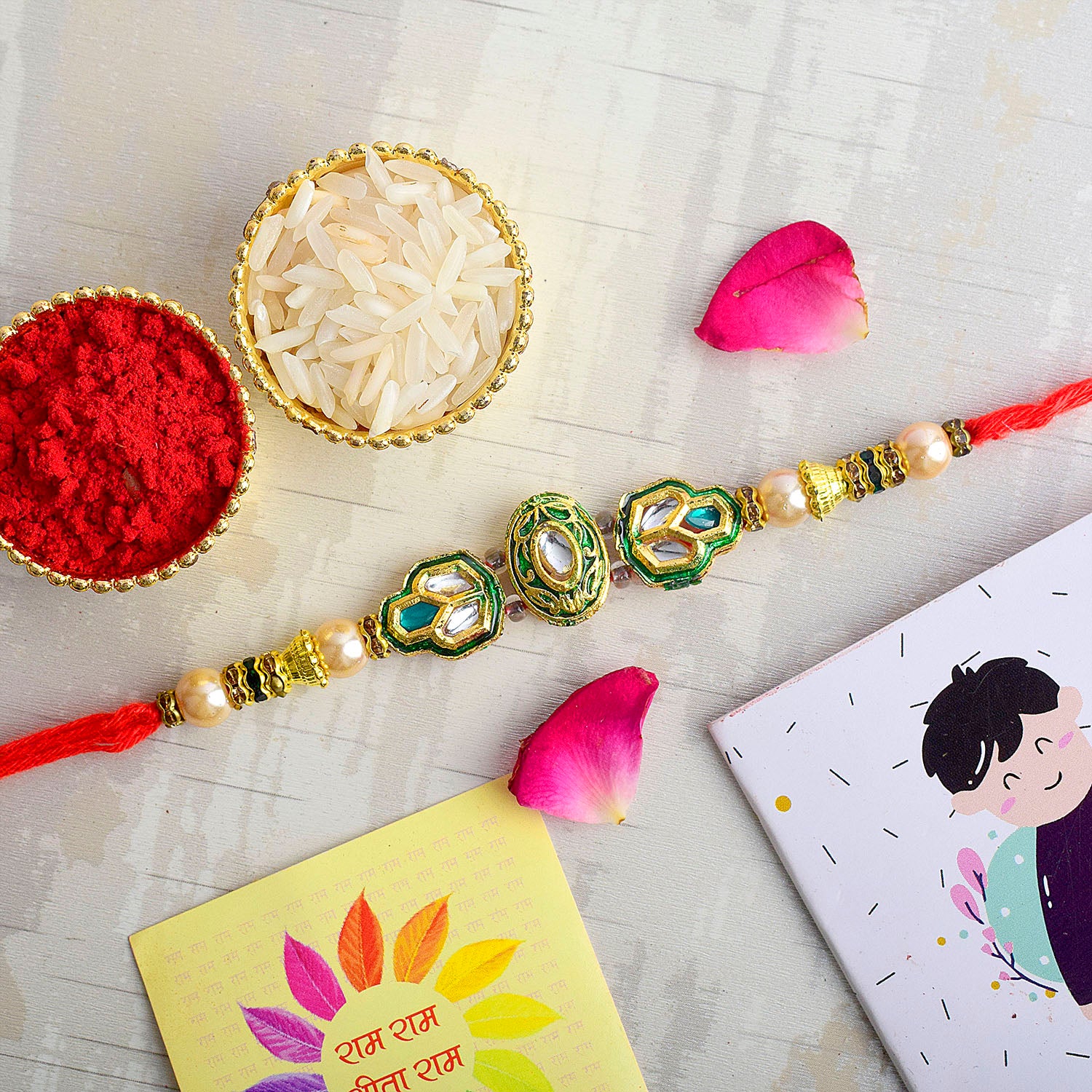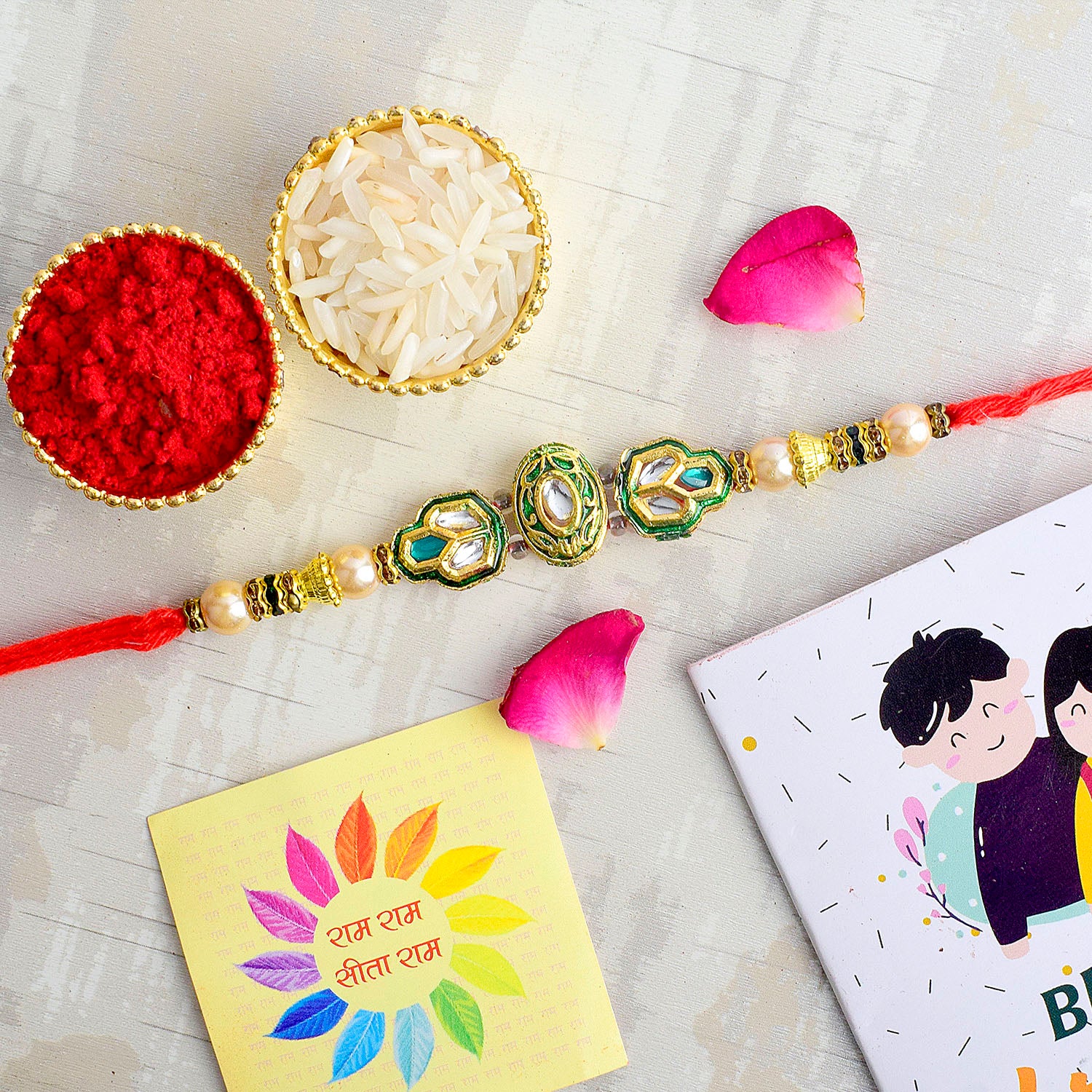 • About Product: Celebrate Raksha Bandhan with our handcrafted Rakhis! Our collection includes beaded Rakhis, elegant Kundan Rakhis, and opulent Zardosi Rakhis, all meticulously designed with love and care. These exquisite creations are a perfect way to express your affection and strengthen the bond with your siblings. Each Rakhi reflects the artistry of our skilled artisans, making them unique and special. Choose from a variety of vibrant colors, intricate patterns, and sparkling stones to find the perfect Rakhi that complements your sibling's style. Embrace the tradition of Raksha Bandhan with our handcrafted Rakhis and create cherished memories that last a lifetime. Shop now and make this Raksha Bandhan an extraordinary celebration of love and togetherness!