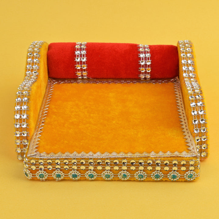 As you place your Laddu Gopal on this sacred throne, watch as the velvet embraces the little lord, showering blessings and grace upon your home. Its charming allure and captivating design make it a true centerpiece of devotion, adding a touch of splendor to your worship space.