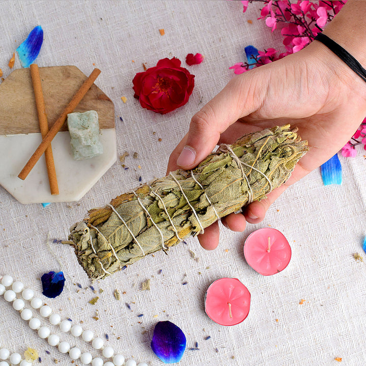 • About Product:Β We at Satvikstore.in Experience the captivating fusion of Mexican Incense Sage with Amazonite Crystal Healing Smudge, available at our online store. Handcrafted with care, this unique blend combines the purifying properties of Mexican incense sage with the calming energy of Amazonite crystal. Clear negative energies, promote serenity, and enhance communication. Perfect for meditation, energy clearing, or creating a tranquil ambiance. Elevate your well-being and embrace the transformative energy of Mexican Incense Sage with Amazonite Crystal Healing Smudge. Shop now and ignite your spiritual journey with this powerful combination of nature's gifts.
