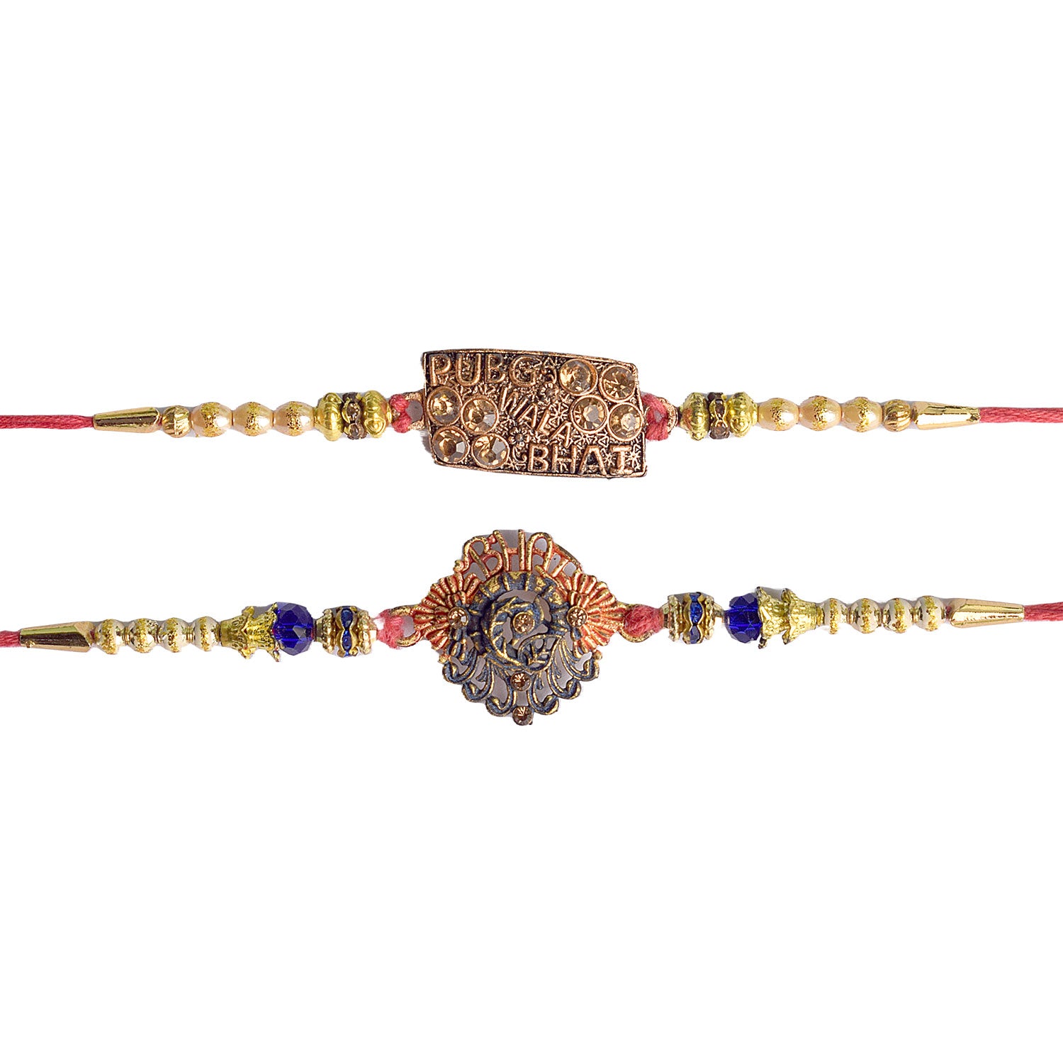 Beaded Bhaiya Rakhi Set of 2: Bedecked with colorful beads, these rakhis represent the joyous moments and cherished memories of growing up together. Embrace nostalgia and affection with this delightful beaded rakhi set.