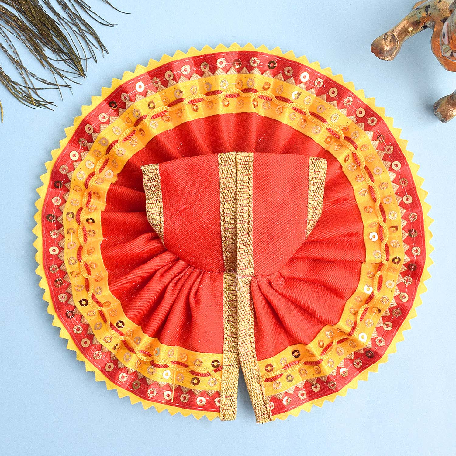 Give your Laddu Gopal a sparkling touch of elegance with this radiant yellow and red dress adorned with a shimmering sequin border. Beautifully crafted from quality fabric, it showcases bright hues and dazzling details that enhance the divine charm of your deity.