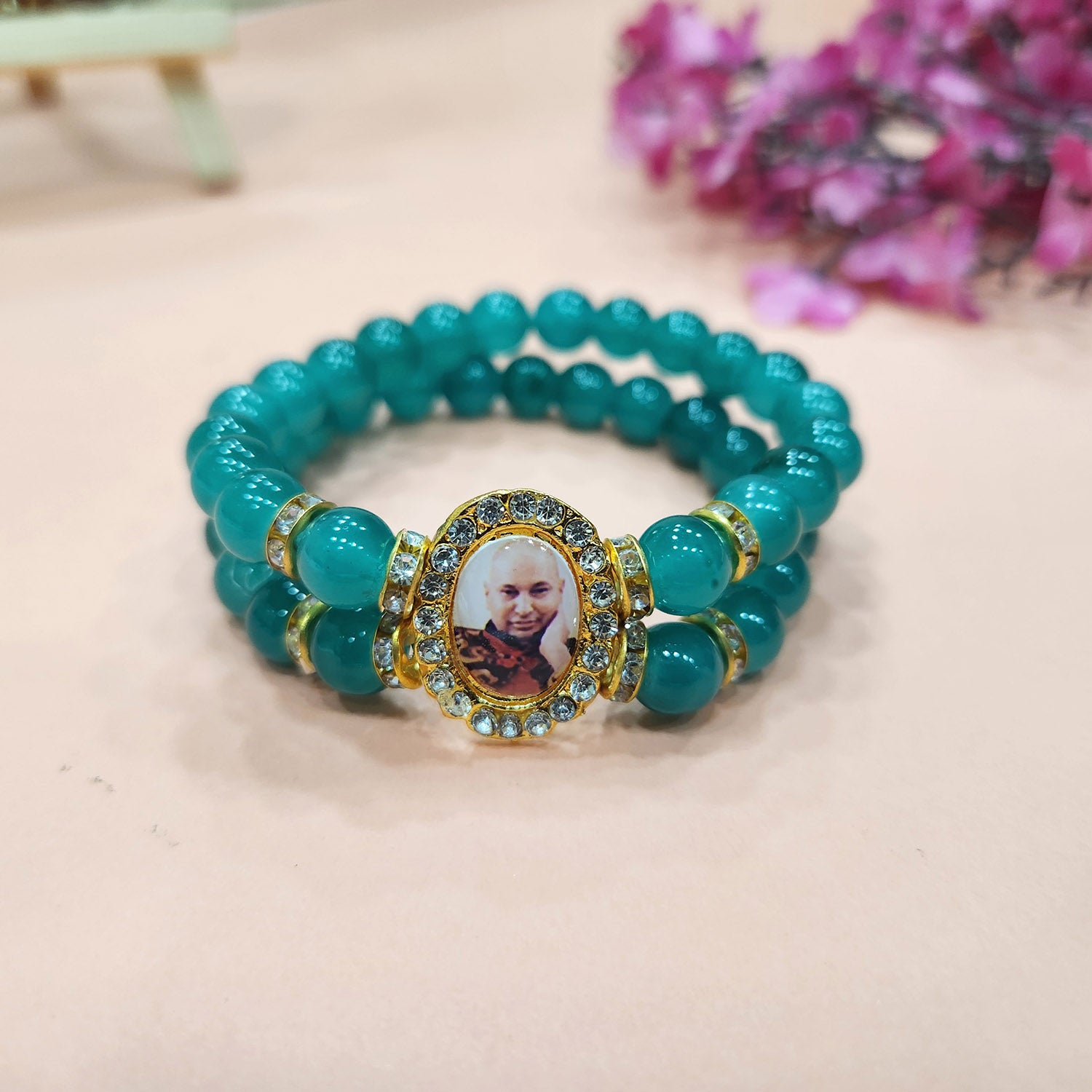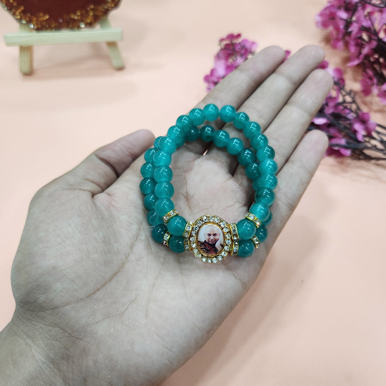 • Item Name: Sea Green Double Band Round Pearl Bracelet with Jai Guruji Swaroop Handmade Bracelets for Men and Women