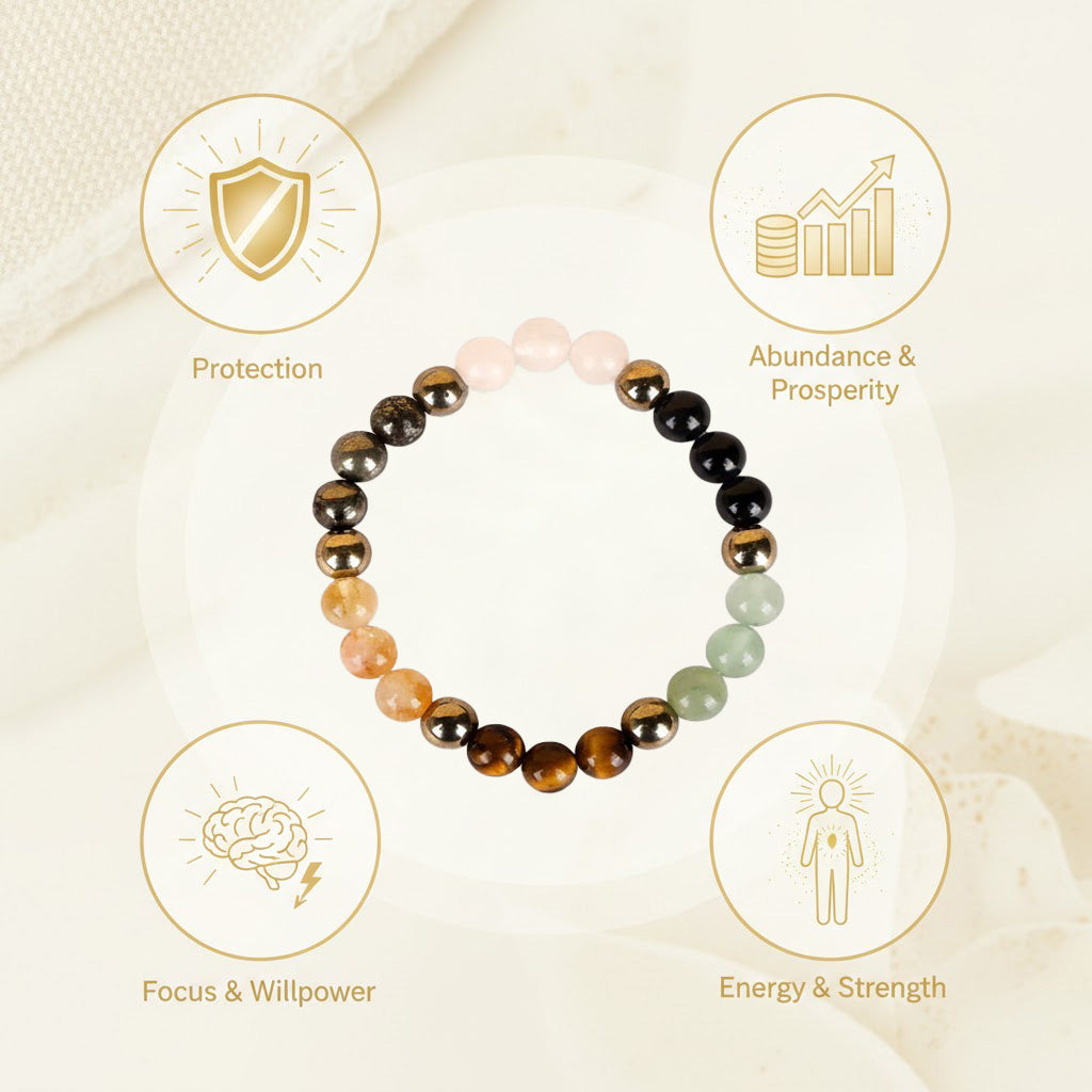 The Dhan Yog Bracelet combines Tiger Eye for confidence and decision-making, Pyrite for wealth attraction and protection, Citrine for manifestation and positivity, Clear Quartz for energy amplification, Green Aventurine for luck and opportunity, and Hematite for grounding and stability. The Raw Pyrite Stone further strengthens money-attracting vibrations and supports continuous prosperity energy in your surroundings.